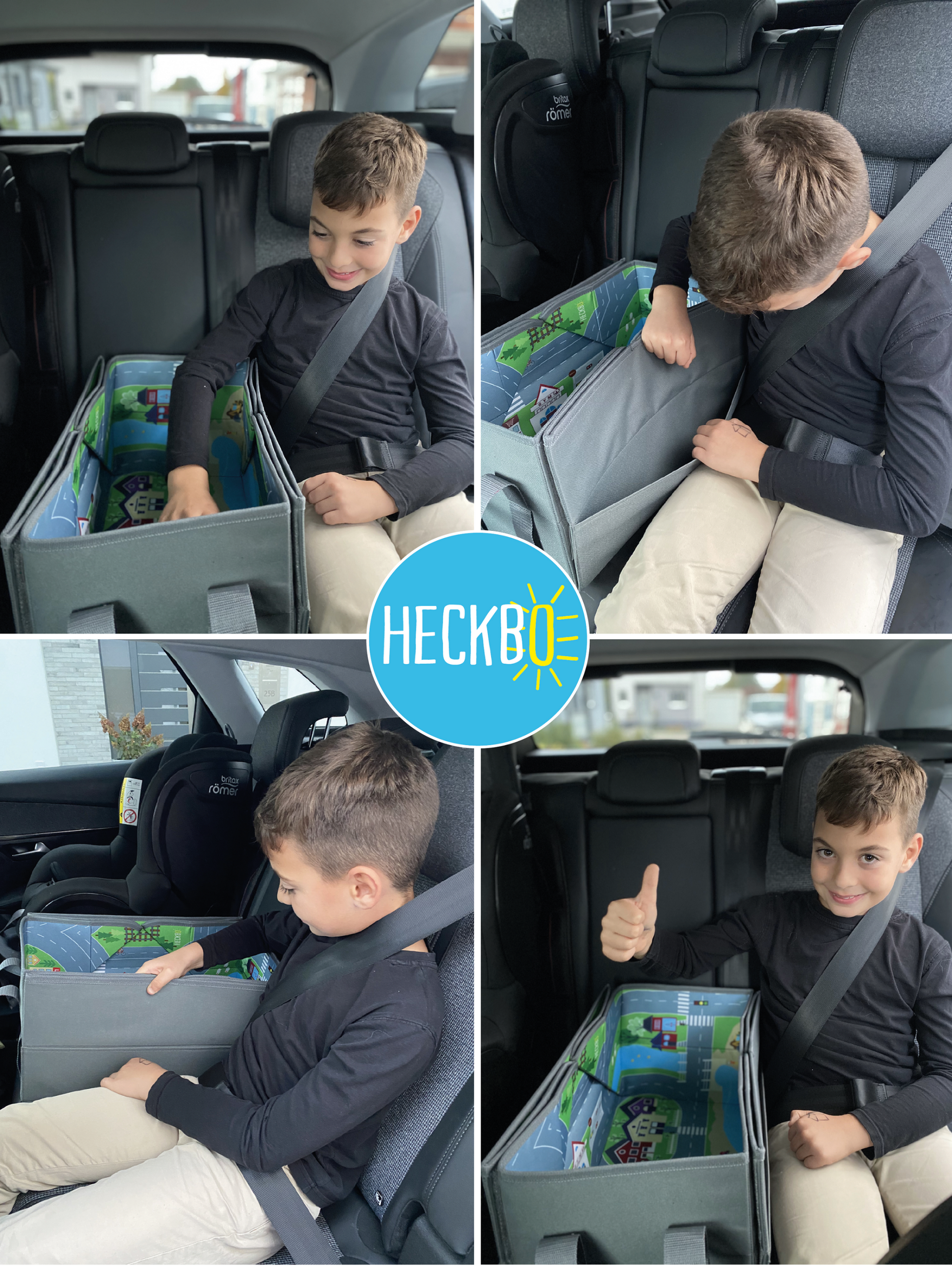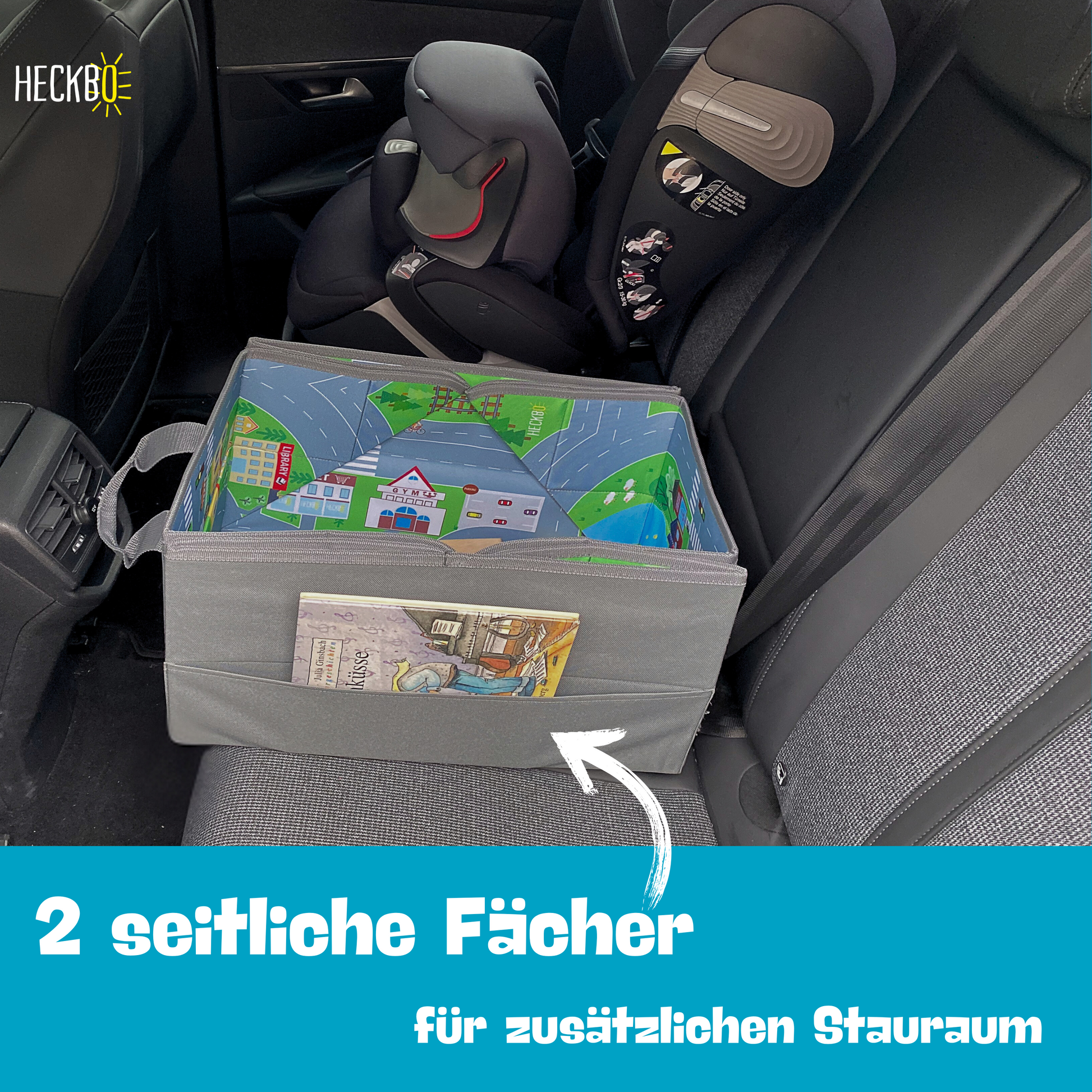 Praktisch und verspielt zugleich: Die HECKBO Box vereint vier Funktionen in einem Produkt – als Auto-Organizer, Spielteppich, Aufbewahrungsbox und flexible Transportlösung für unterwegs.