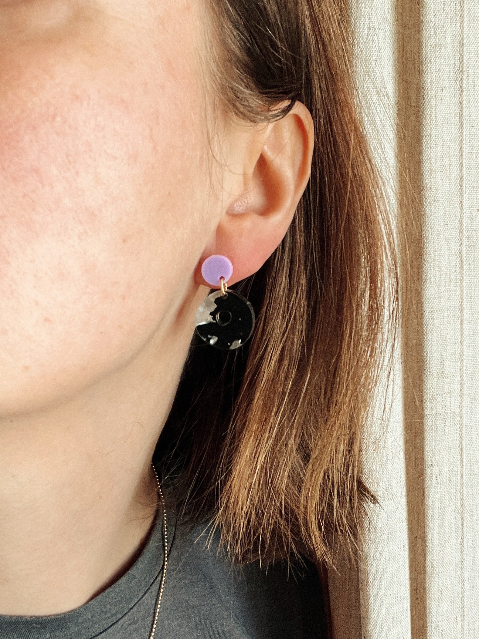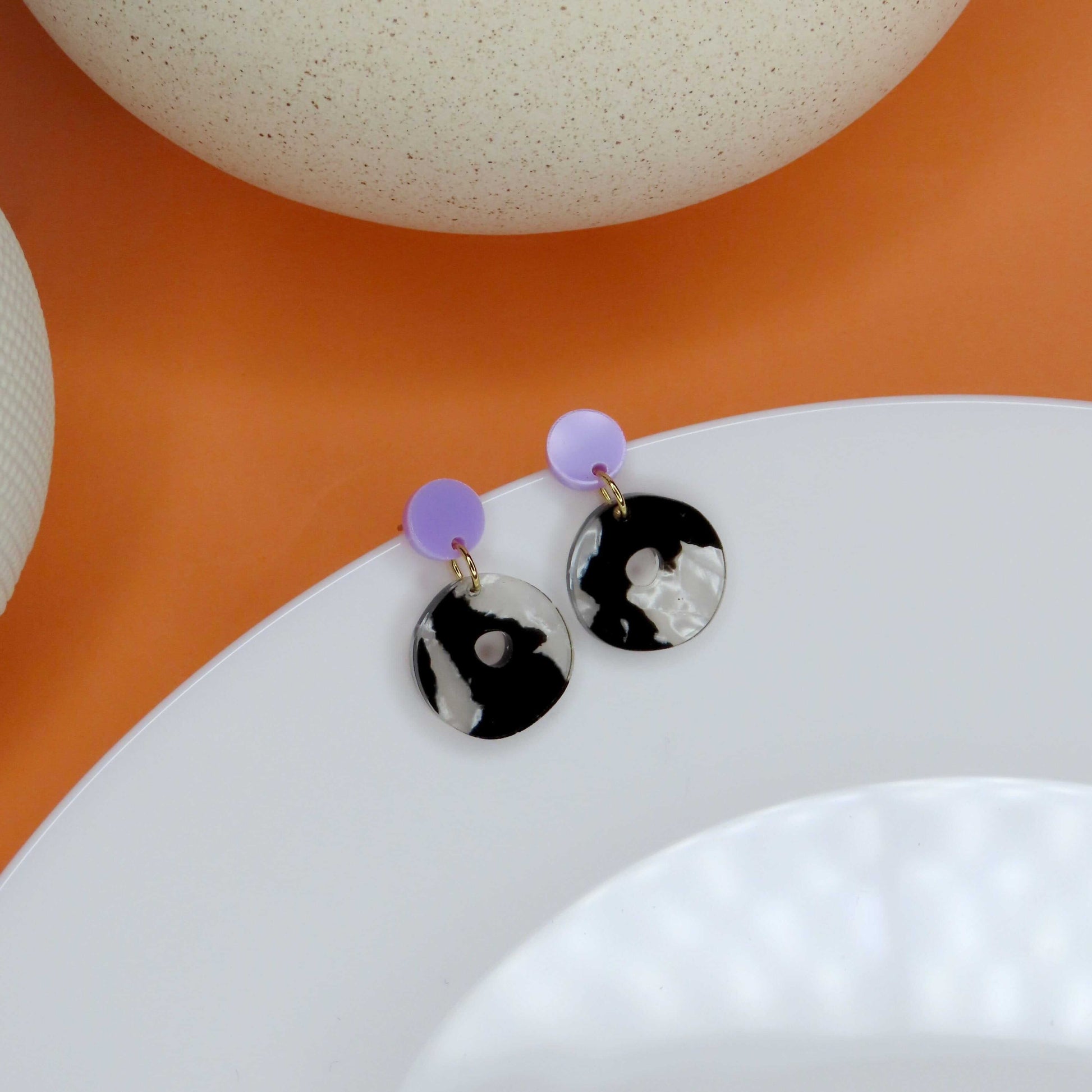 Diese Ohrringe haben Charakter! Die Kombination aus fliederfarbenem Stecker und grafisch gemustertem Acetat-Anhänger wirkt modern, verspielt und individuell. Durch das Lasern entsteht bei jedem Paar ein neues, einzigartiges Muster – kein Stück gleicht dem anderen!