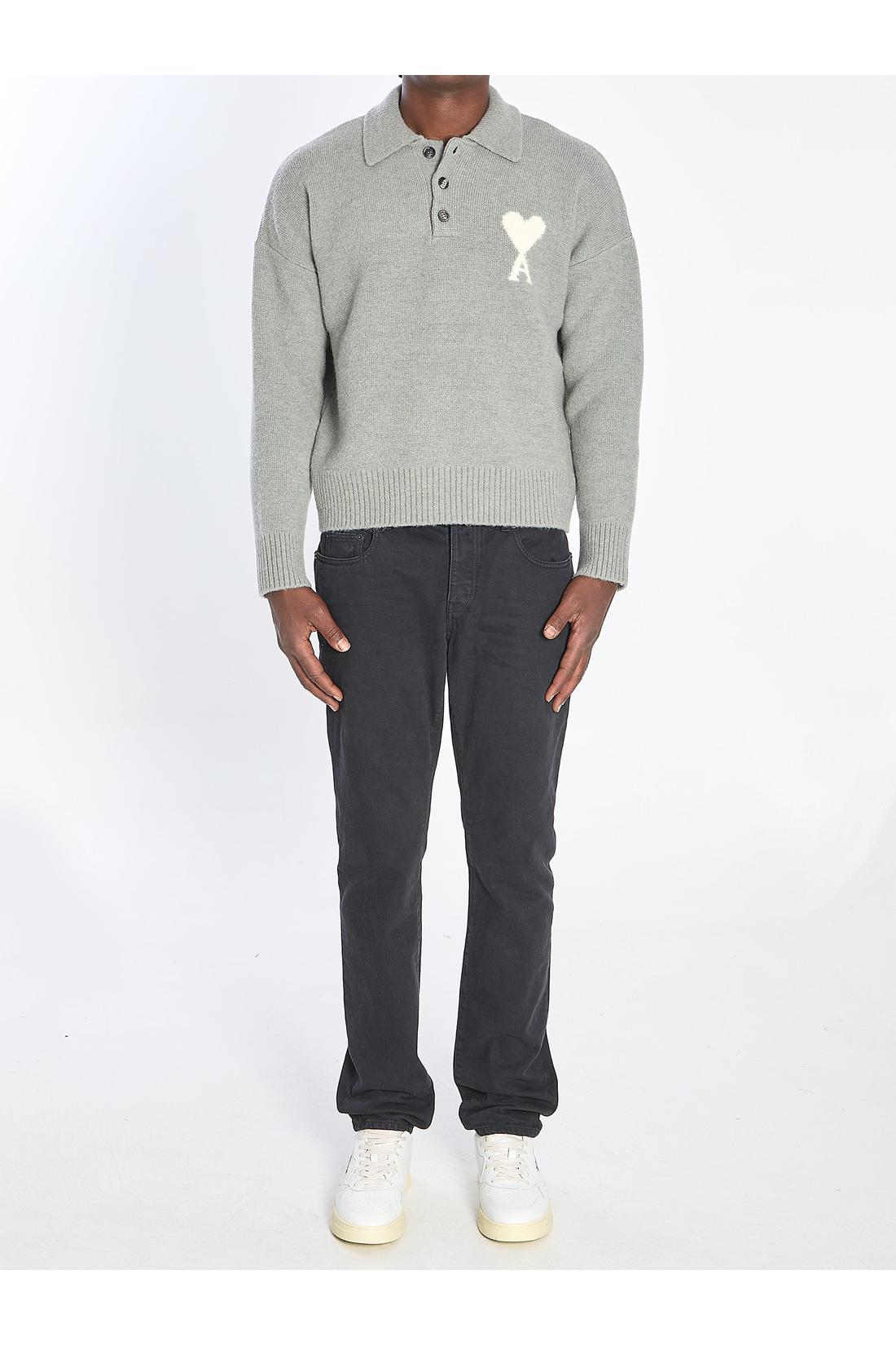 Polo made of a blend of alpaca, wool, and polyamide with a felted effect in grey color. Features a polo collar with three buttons, long sleeves, an intarsia Ami de Coeur logo on the chest in ivory color, ribbed hem and cuffs. Regular fit.