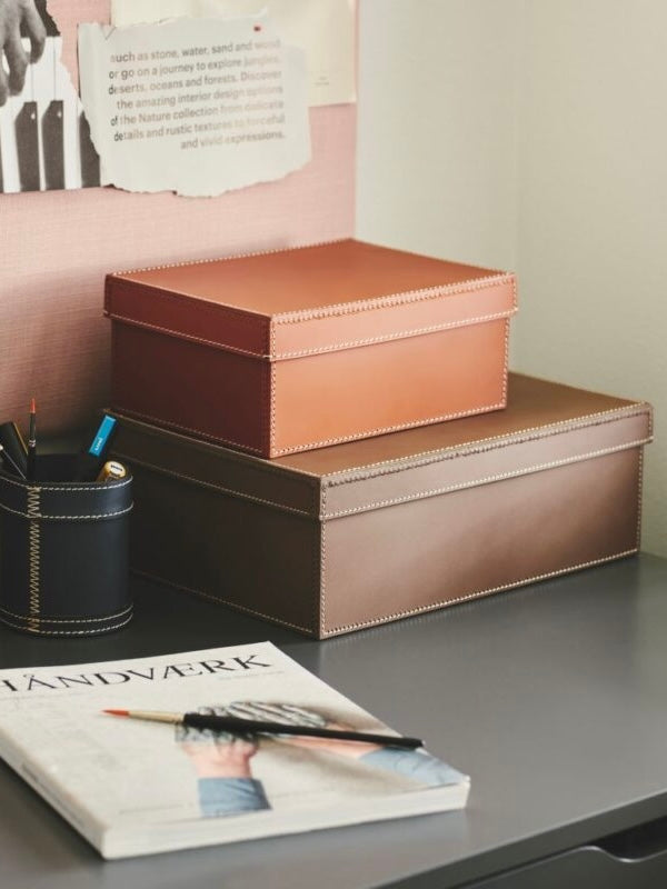 Hochwertige Aufbewahrungsbox mit Deckel und Kontraststeppung, aus recyceltem Leder gefertigt. Ideal für Utensilien und Briefe oder im Kinderzimmer für Spielzeug.