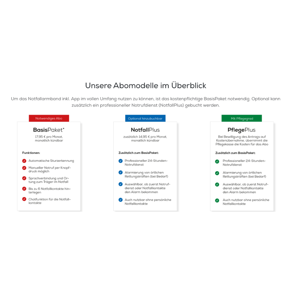 * Abschluss eines kostenpflichtigen Abos (siehe Abomodelle) notwendig. Armbandträger benötigt kein Smartphone.