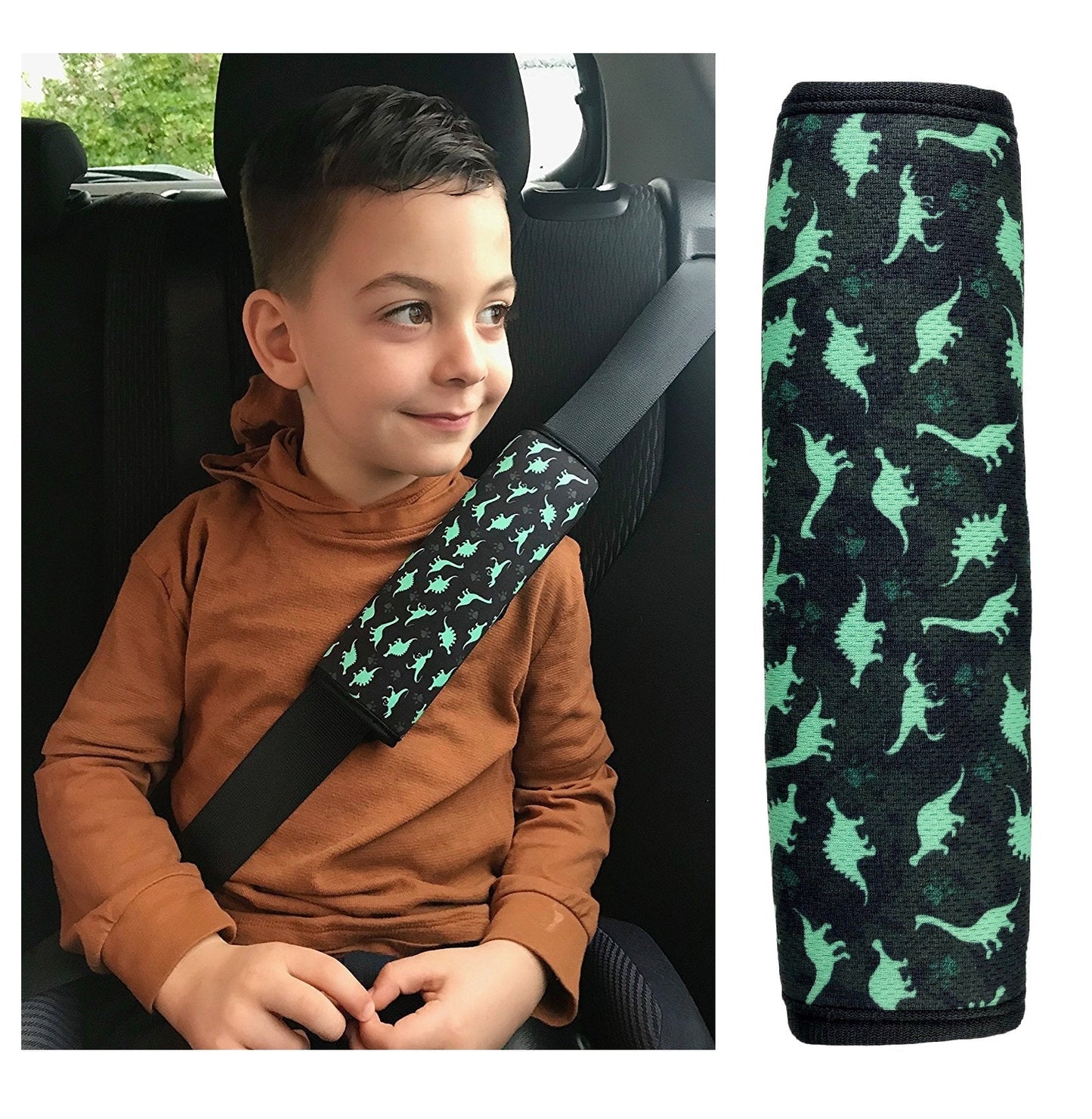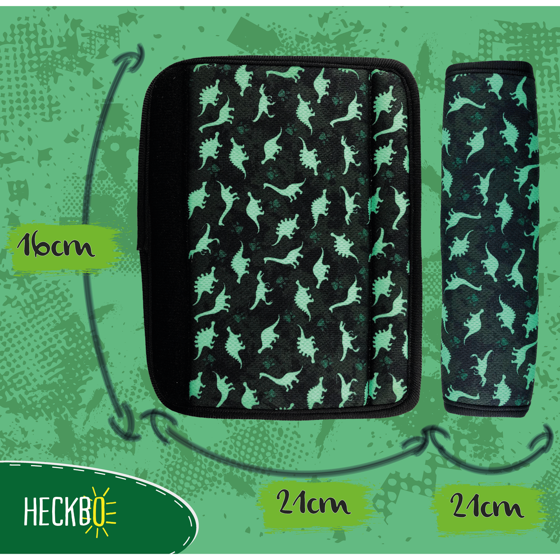 📦 LIEFERUMFANG & MAßE: 1x oder 2x HECKBO Gurtschoner mit Dino-Motiv. Farben: Grün, Schwarz. Größe: 16 × 21 cm (aufgefaltet), 6 × 21 cm (zusammengefaltet). Material: 100 % Polyester (Außenmaterial), 100 % Polyethylen (Füllung).