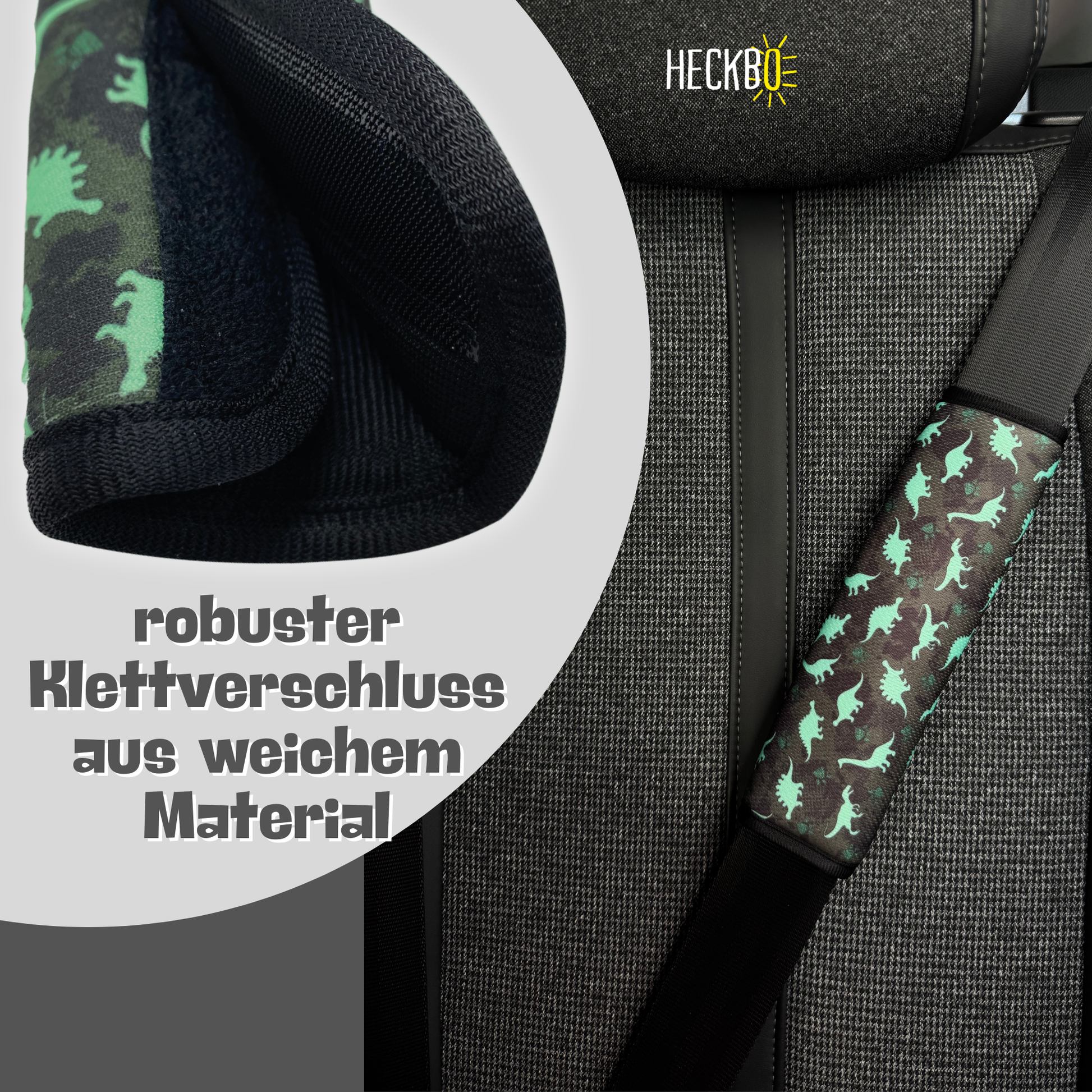 🦖 KINDERGERECHTES DINO-MOTIV: HECKBO Gurtschoner mit coolem Dinosaurier-Design in modernen Tarnfarben – ein echtes Highlight für alle Dino-Fans.