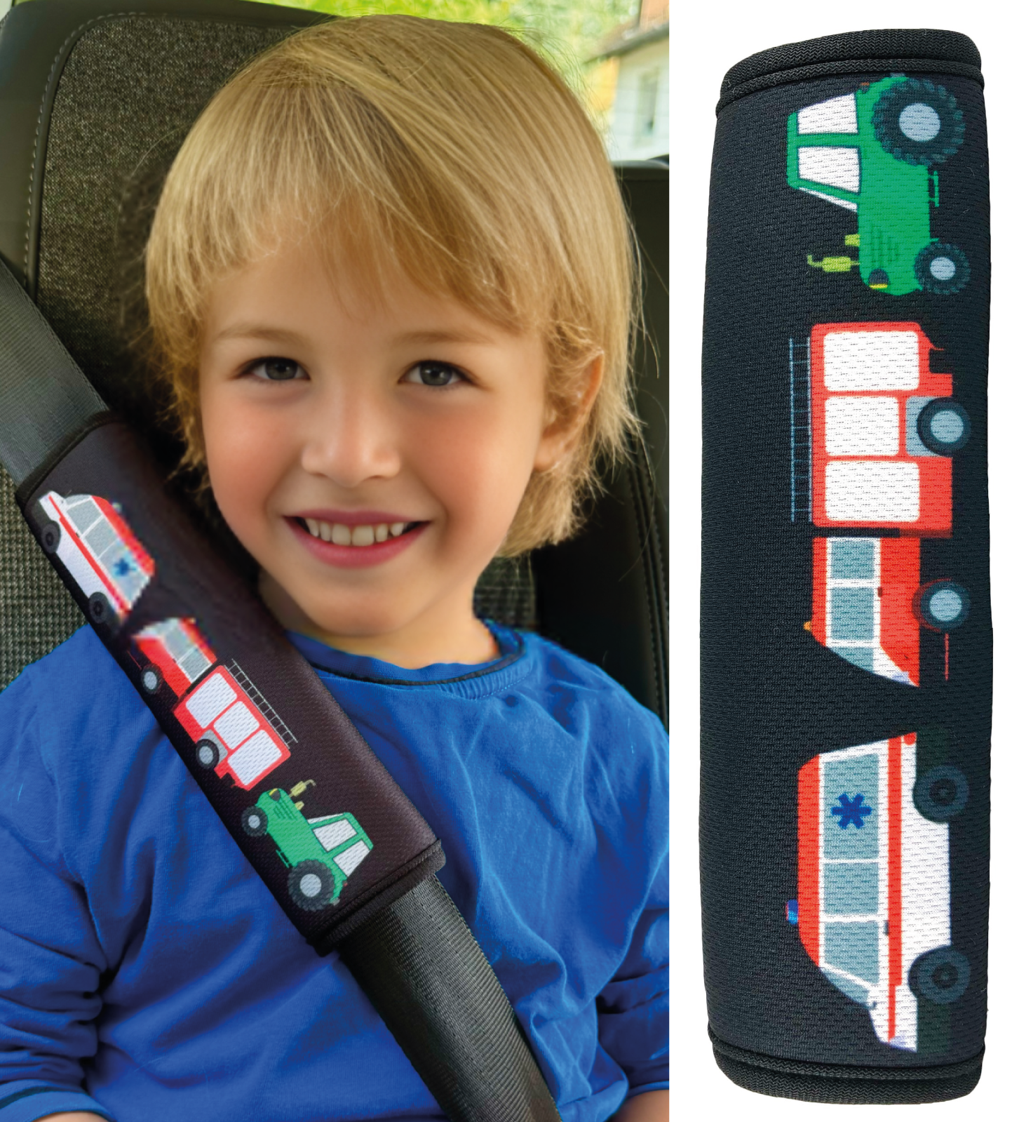 🚒 KINDERGERECHTES FAHRZEUG-MOTIV: HECKBO Gurtschoner mit coolen Fahrzeugen wie Feuerwehr, Krankenwagen und Traktor – ideal für kleine Autofans und perfekt für Jungen, die Einsatzfahrzeuge lieben.