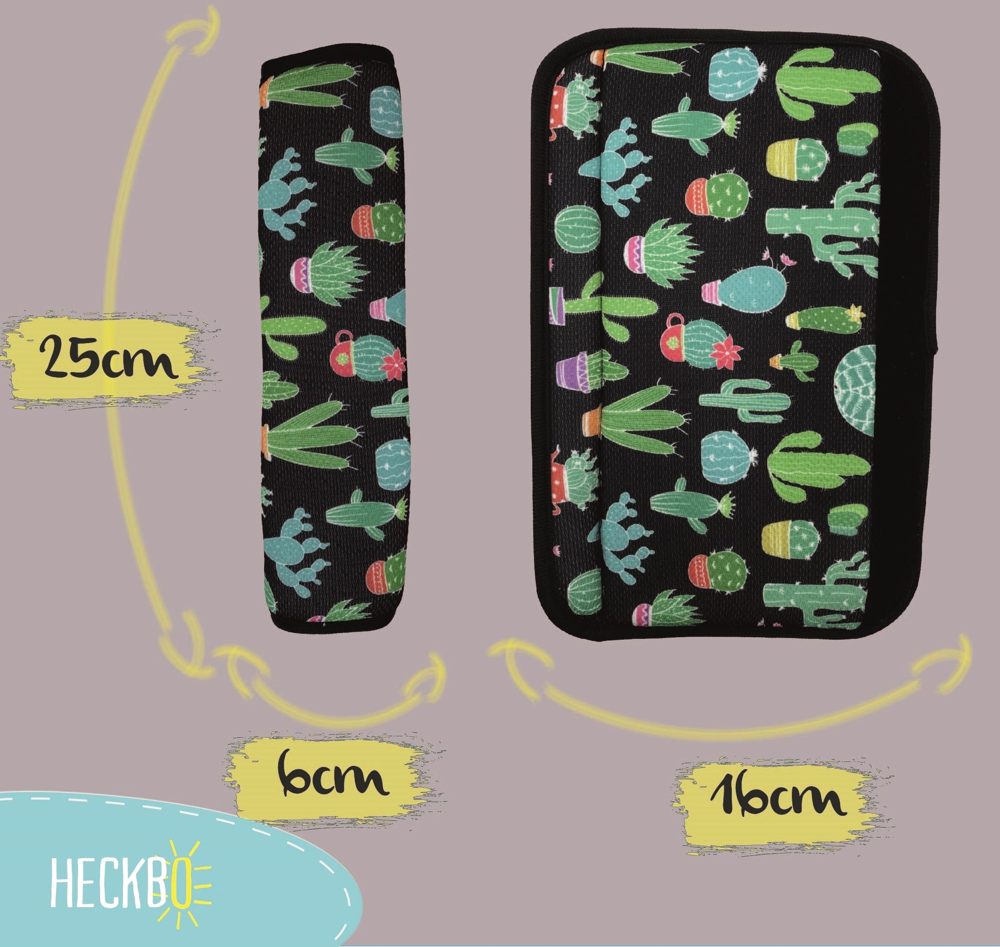 Sie erhalten 1 oder 2 HECKBO Gurtkissen für Erwachsene mit einem stilvollen Kaktus-Design in frischen Farben. Die Kakteen sind in verschiedenen Größen und Formen gestaltet – ein trendiges Accessoire für jedes Auto.