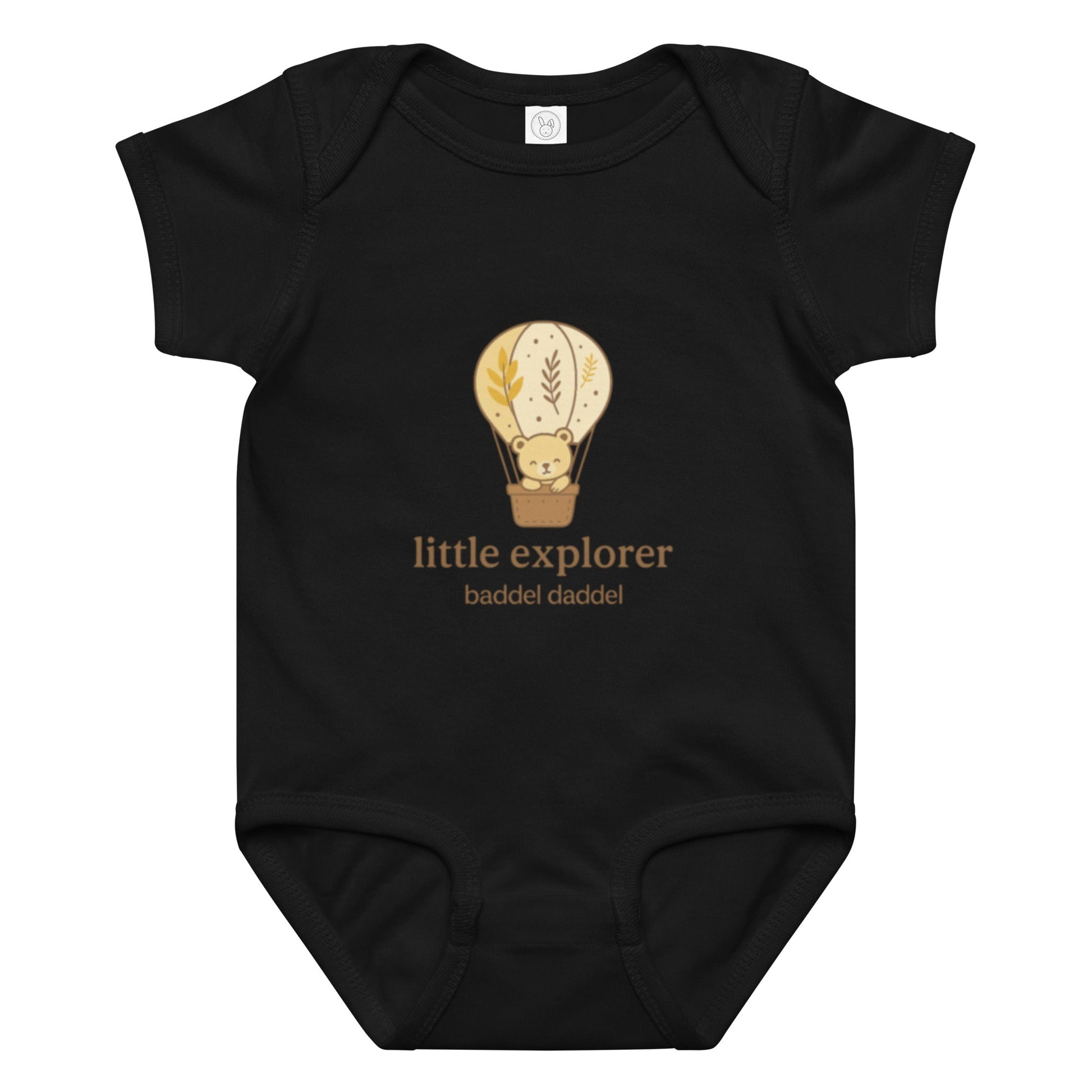 Mit diesem Baby Jersey-Body heben kleine Abenteurer stilvoll ab! Das niedliche Heißluftballon-Motiv mit dem „Little Explorer“-Schriftzug bringt nicht nur Entdeckerlaune ins Kinderzimmer, sondern überzeugt auch mit einem durchdachten Tragekomfort. Der super weiche Baumwollstoff schützt zarte Haut, während Schlupfkragen und Druckknöpfe im Schritt schnelle Outfitwechsel ermöglichen. Ideal für den turbulenten Babyalltag – bequem, funktional und einfach zauberhaft im typischen Baddeldaddel Look.