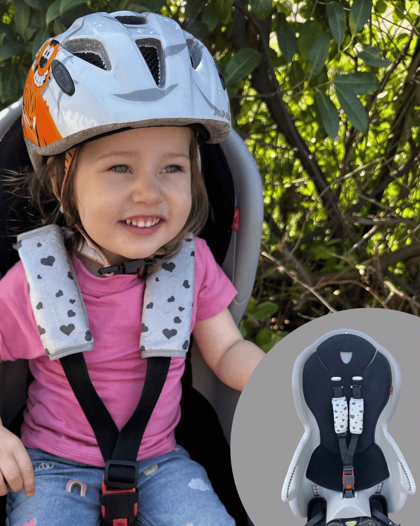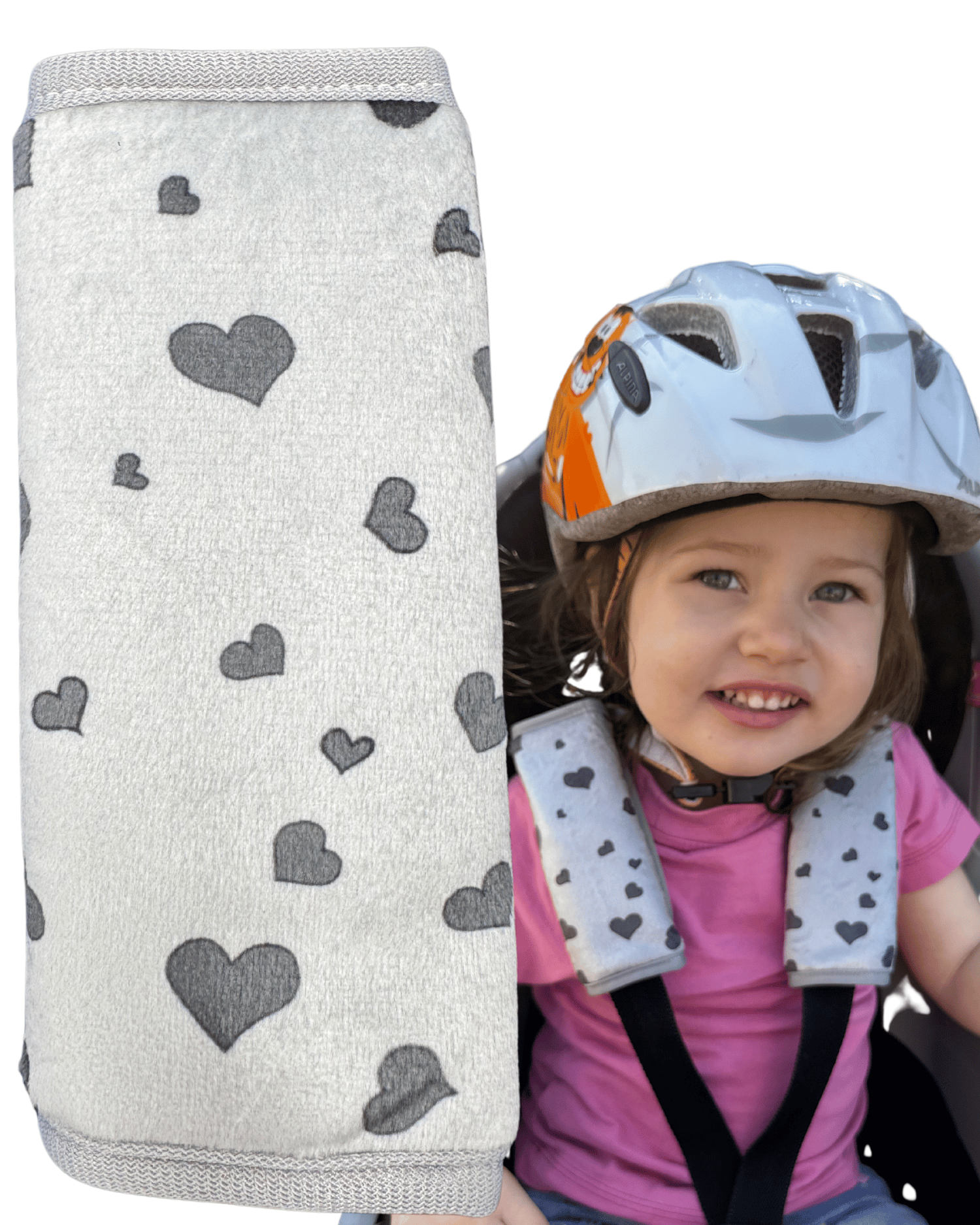 🖤 BABY GURTSCHONER MIT MODERNEM HERZ-DESIGN: 2 HECKBO Gurtkissen mit schwarzem Herz-Muster auf hellgrauem Hintergrund – ein stilvoller und neutraler Look, der sich harmonisch in Babyschalen, Kindersitze oder Buggys einfügt.