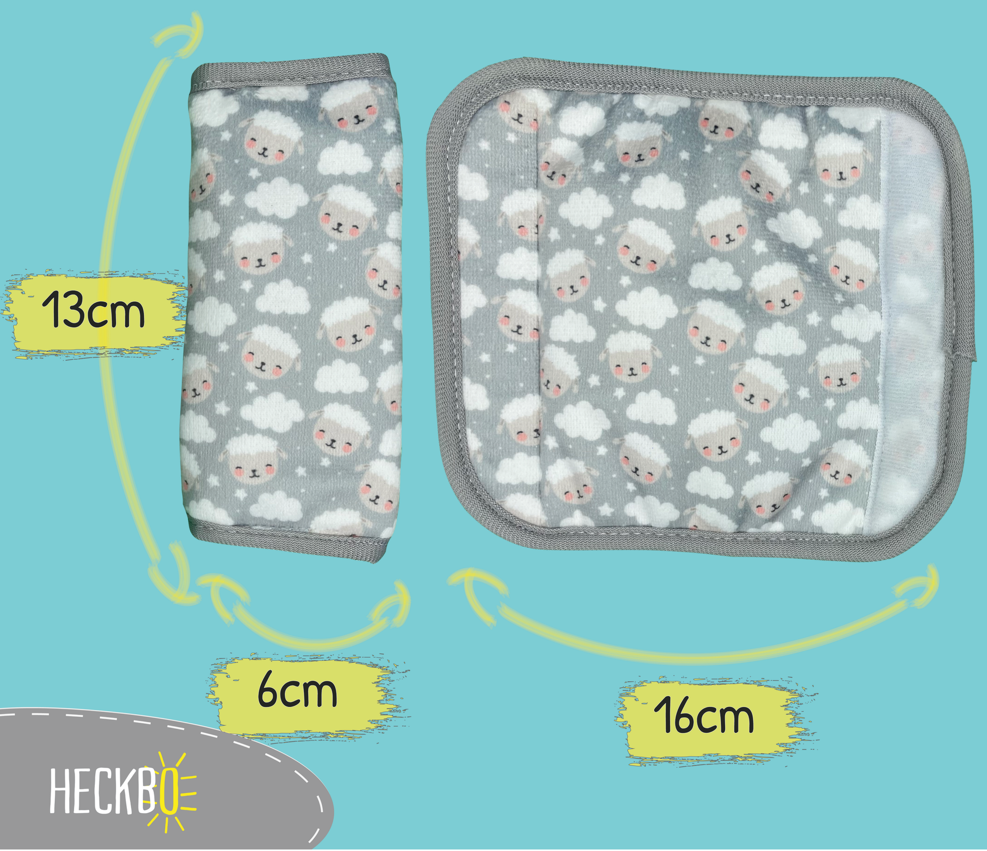 🐑 BABY GURTSCHONER MIT SCHAF-MOTIV: Set aus 2 HECKBO Gurtkissen mit niedlichen Schafen und zarten Wolken auf hellgrauem Hintergrund – passt farblich zu nahezu allen Babyschalen und Kindersitzen.