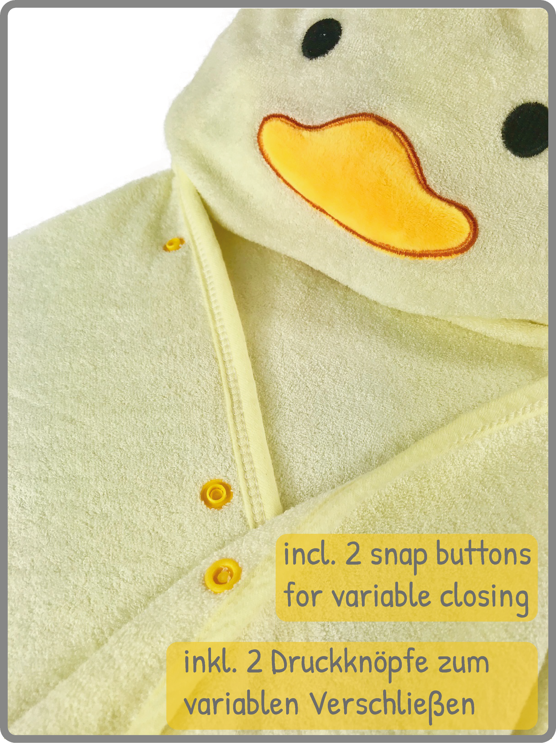 ? Sicherer und flexibler Halt: Dank praktischer Druckknöpfe bleibt das Kapuzen-Badetuch auch beim Spielen oder Wickeln sicher an Ort und Stelle, und passt sich flexibel dem Körper Ihres Babys an.