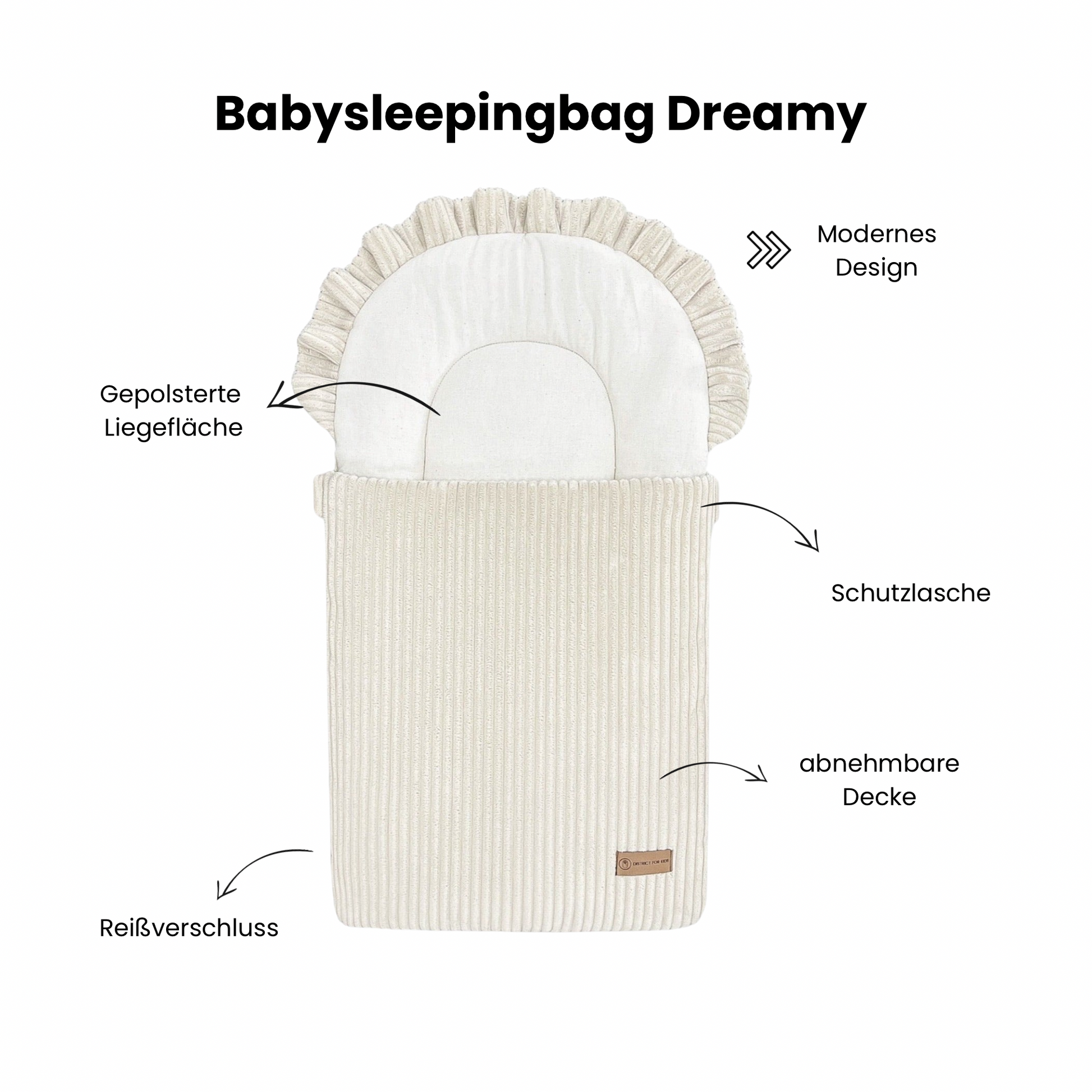 Der Babyschlafsack mit Rüschenkrone aus Cord & Baumwolle von District4Kids vereint Stil, Komfort & Sicherheit. Mit seinem klassischen Steckkissen-Design und dem verspielten Rüschenrand wird er zum Blickfang im Babyzimmer – gleichzeitig sorgt er für einen sicheren & geborgenen Schlaf.