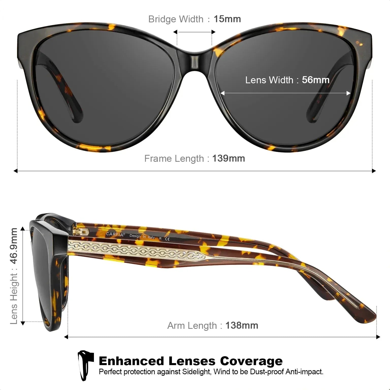 - Women's Cateye Sunglasses - These women's polarized sunglasses captivate you with their chic cat-eye style, sleek lines, and bold arms, showing your dazzling appeal and matching perfectly with accessories to make you shine. The flattering cat-eye shape conveys an on-trend look that best complements oval, heart-shaped, round, square, and rectangular faces.