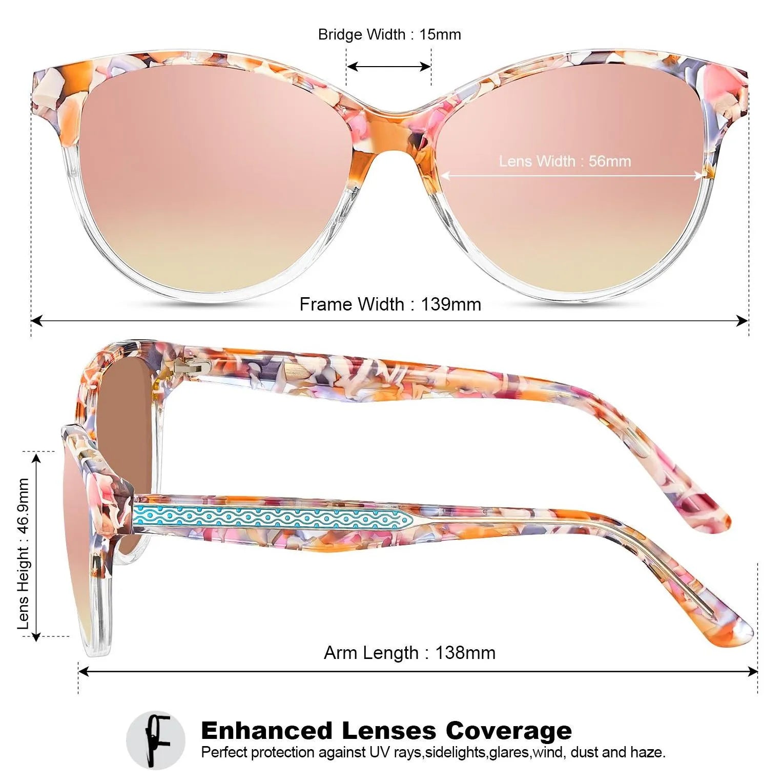 - Women's Sunglasses with Polarized UV Protection - Our women's mirrored sunglasses are effective UV filters, as the lenses block 100% of harmful UVA/UVB rays up to 400nm, protecting your eyes from squinting, fatigue, and wrinkles. The polarized TAC lenses also eliminate 99% horizontal glare, offering you the highest level of light reduction for the richest colors, the sharpest contrast, and improved visual clarity.