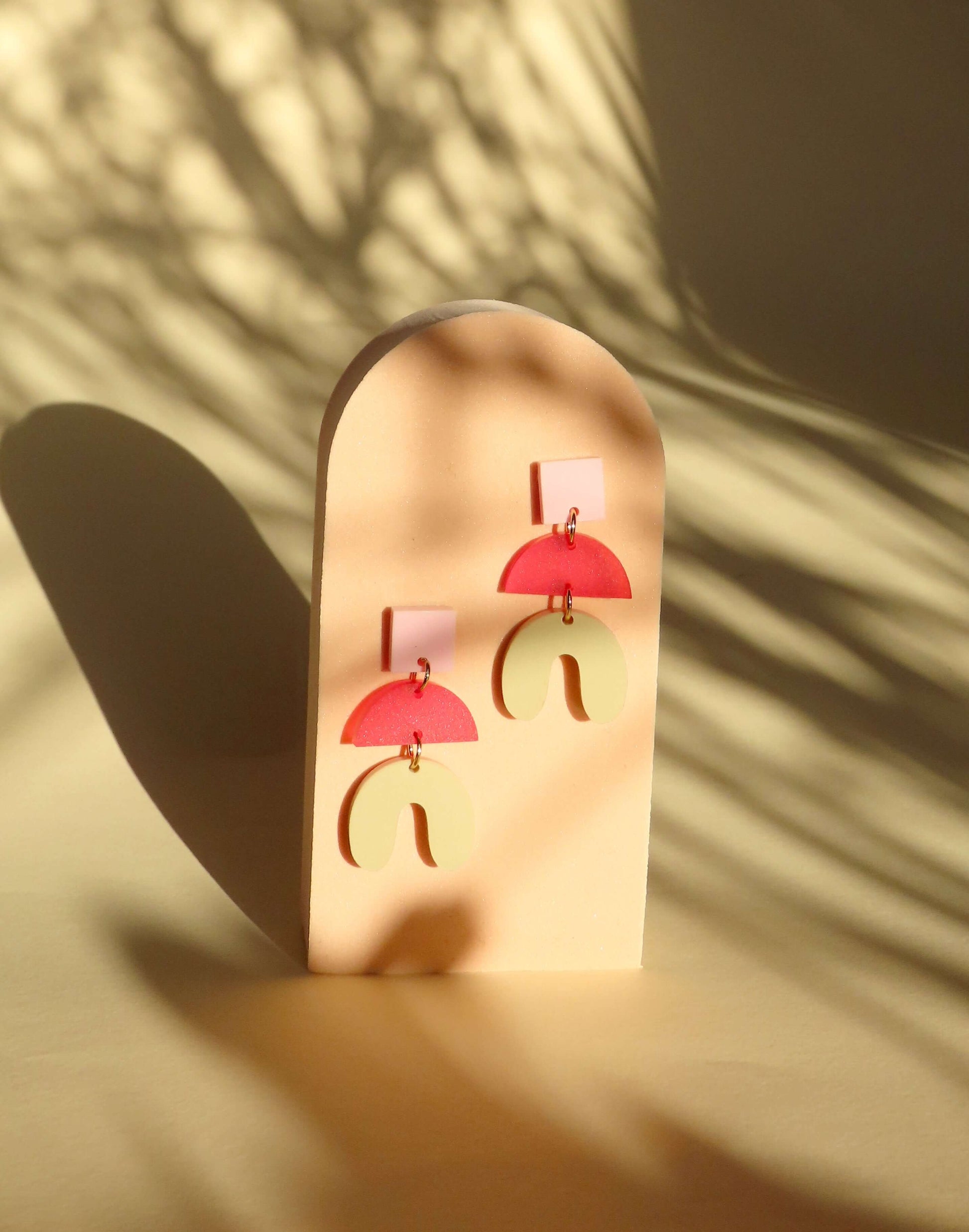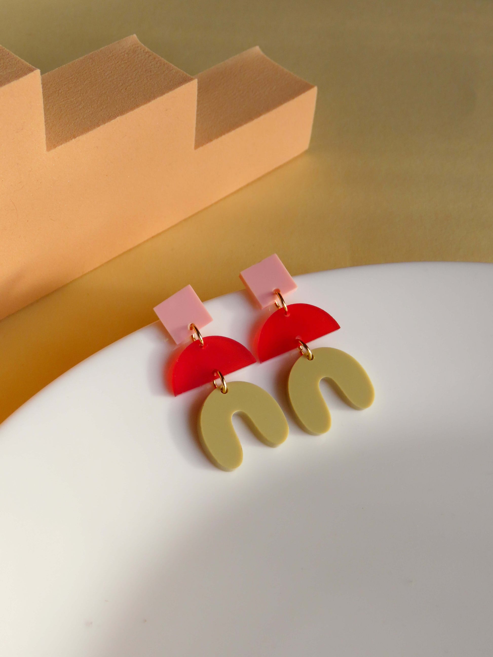 Die Kombination dieser klaren Formen – Quadrat, Halbkreis und geschwungene Kurve – wirkt grafisch und gleichzeitig verspielt. Rosa sorgt für Sanftheit, Rot setzt das Statement, und Beige erdet das Ganze harmonisch. Acryl macht die Ohrringe ultraleicht, während Edelstahl für Tragekomfort sorgt.