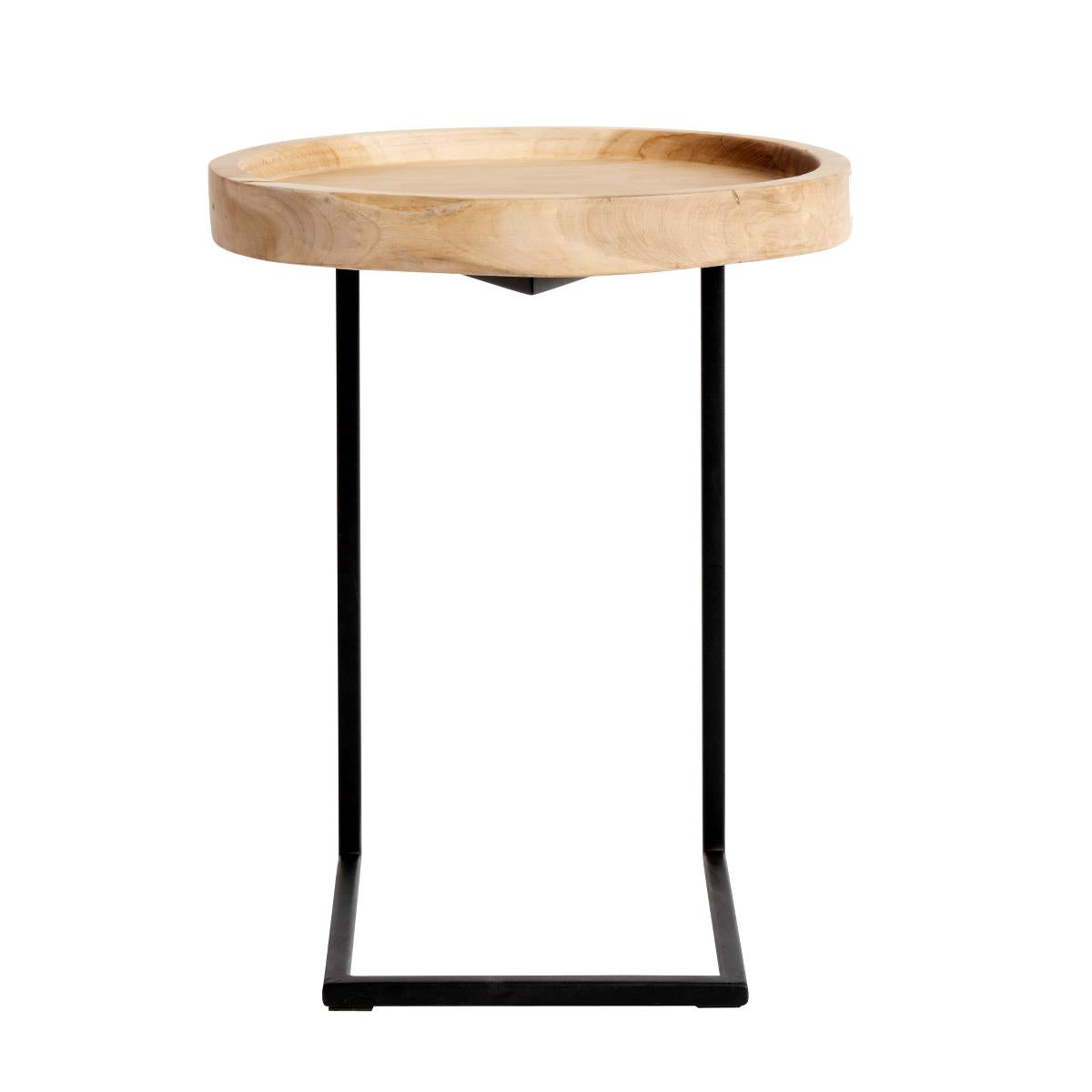 Schlichter Beistelltisch aus recyceltem Teakholz mit runder Tischplatte. Das eckige Gestell ist aus Eisen. Die Tischplatte ist eingelassen und hat dadurch eine praktische Holzumrandung. Jedes Teil ein Unikat.