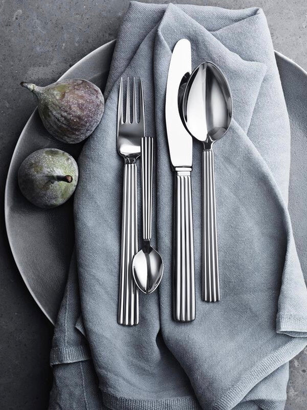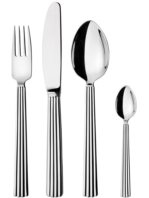 Die charakteristischen Rillen an den Griffen des Bernadotte Bestecks verleihen ihm nicht nur eine klassische Art-Deco-inspirierte Dekoration, sondern bieten auch eine gute Griffigkeit – ein perfektes Beispiel für Form und Funktion. Dieses 4er-Set aus hochglanzpoliertem Edelstahl ist der perfekte Anfang für den Aufbau einer größeren Kollektion.