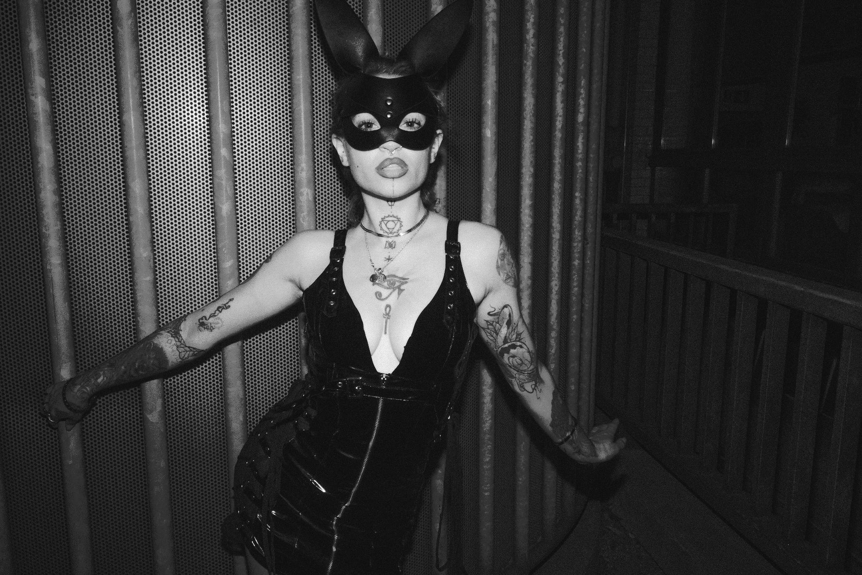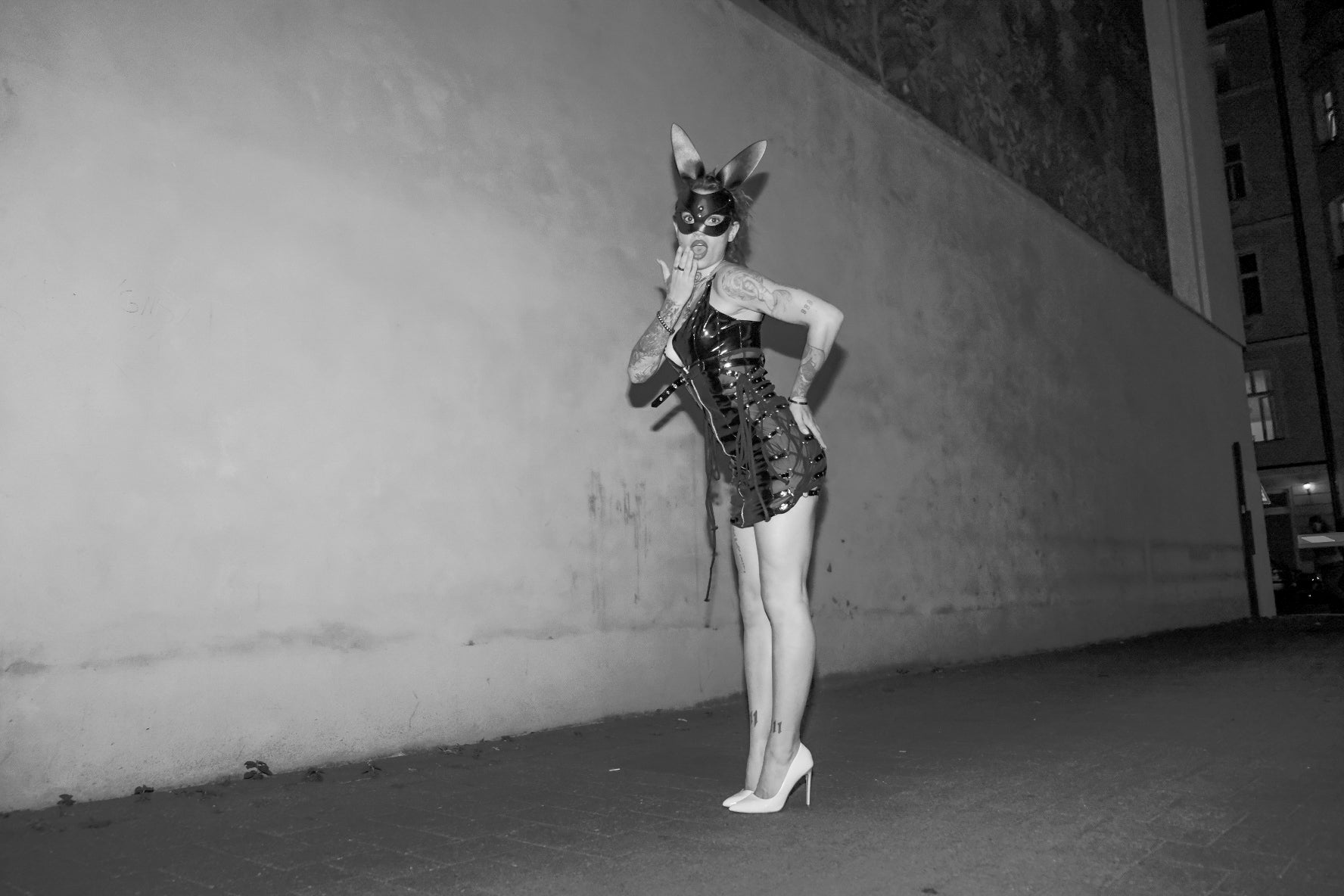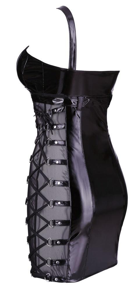 A short dress is completely made out of shiny black vinyl. The dress has decorative lacing at either side and stretchy Powernet inserts underneath it. It is tight-fitting and has a very low-cut neckline. The strap below the cleavage area and the straps can be adjusted with buckles for a perfect fit. The practical, full-length metal zip at the front can be opened quickly for erotic fun.