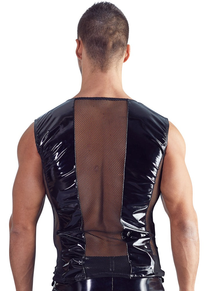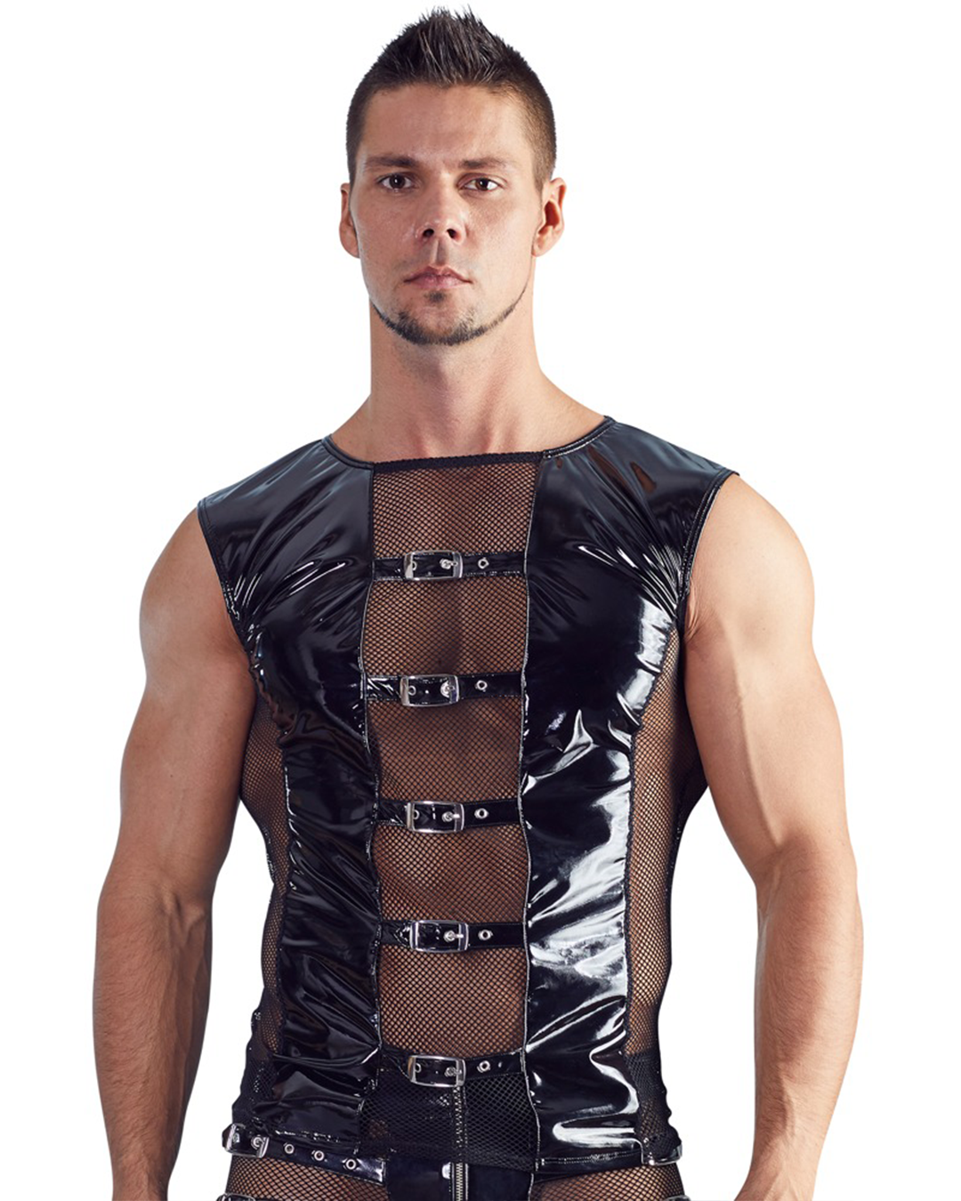 Shiny shirt made out of bi-elastic vinyl with stretchy net inserts at the front and the back. It is comfortable to wear and has 5 stylish straps at the front with buckles.