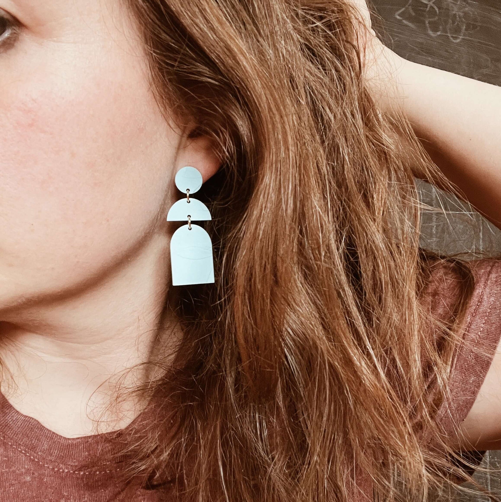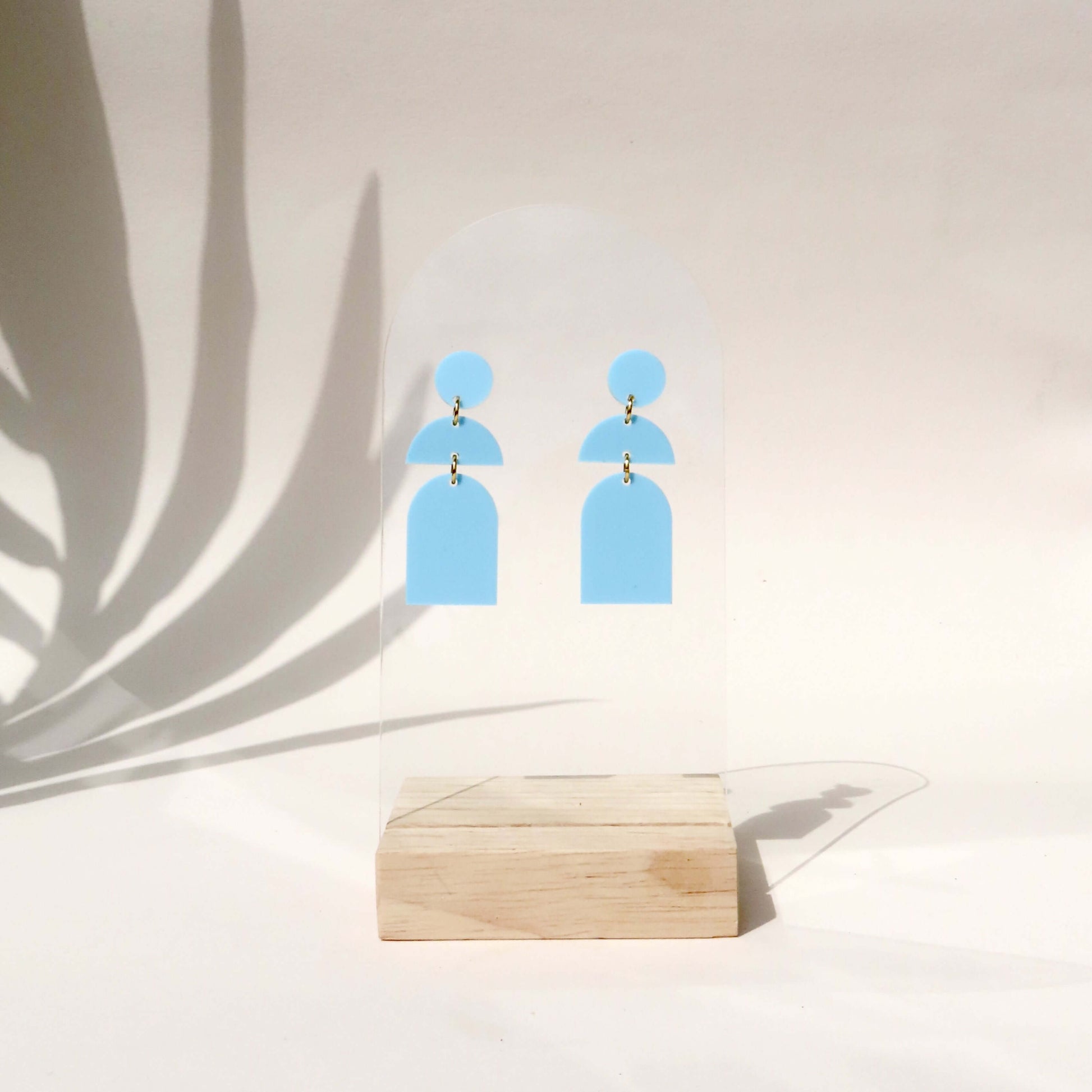 Lust auf einen Farbklecks? Diese Ohrringe in zartem Hellblau setzen ein stylisches Statement – ganz ohne laut zu sein. Drei geometrische Elemente - Kreis, Halbkreis und Bogen- hängen beweglich aneinander und spielen mit Licht und Form. Ein Hingucker bei jeder Bewegung.