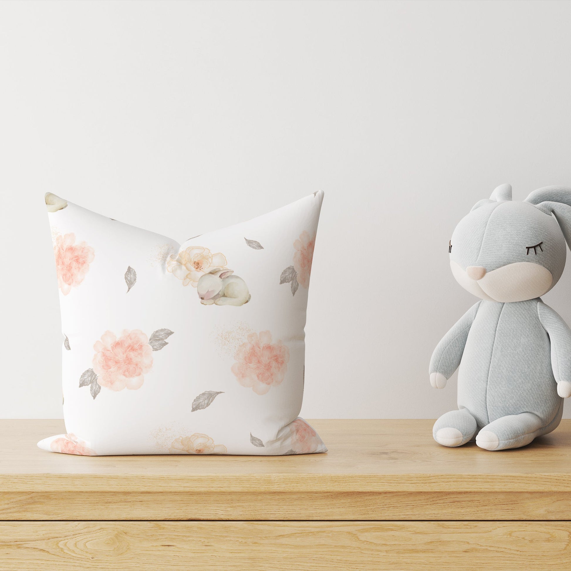 Zauberhafte Traumwelt: Das Dekokissen "Blumenhase" entführt in eine Welt aus sanften Rosa-Blüten. An manchen Blüten findet man kleine, schlummernde Hasen, die ein Nickerchen halten. Ein wahr gewordener Traum für jedes Kinderzimmer, in dem Fantasie und Geborgenheit im Vordergrund stehen.