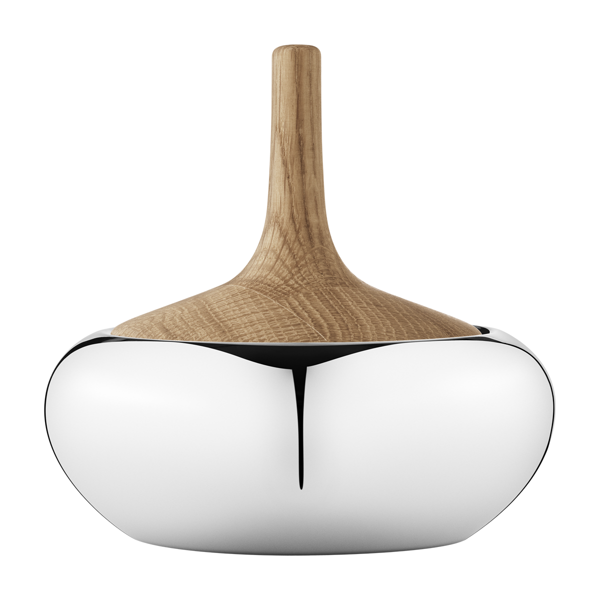 Inspiriert wurde diese Bonbonniere von den durch Henning Koppel in den 1960er Jahren designten Silber-Bonbonnieren. Ursprünglich war sie in dunklem Holz und Silber gedacht, aber der Mix aus coolem Edelstahl und warmem Eichenholz verleiht Henning Koppels zeitlosem Design einen edlen modernen Look. Zur Aufbewahrung wertvoller kleiner Dinge oder zum Servieren von Süßigkeiten.