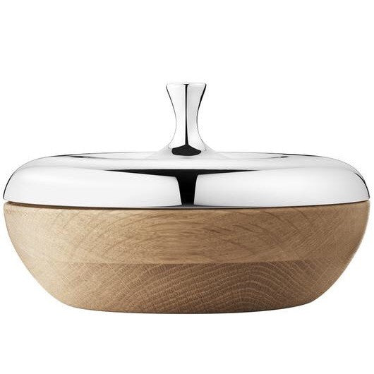 Inspiriert wurde diese Bonbonniere von den durch Henning Koppel in den 1960er Jahren designten Silber-Bonbonnieren. Ursprünglich war sie in dunklem Holz und Silber gedacht, aber der Mix aus coolem Edelstahl und warmem Eichenholz verleiht Henning Koppels zeitlosem Design einen edlen modernen Look. Zur Aufbewahrung wertvoller kleiner Dinge oder zum Servieren von Süßigkeiten.