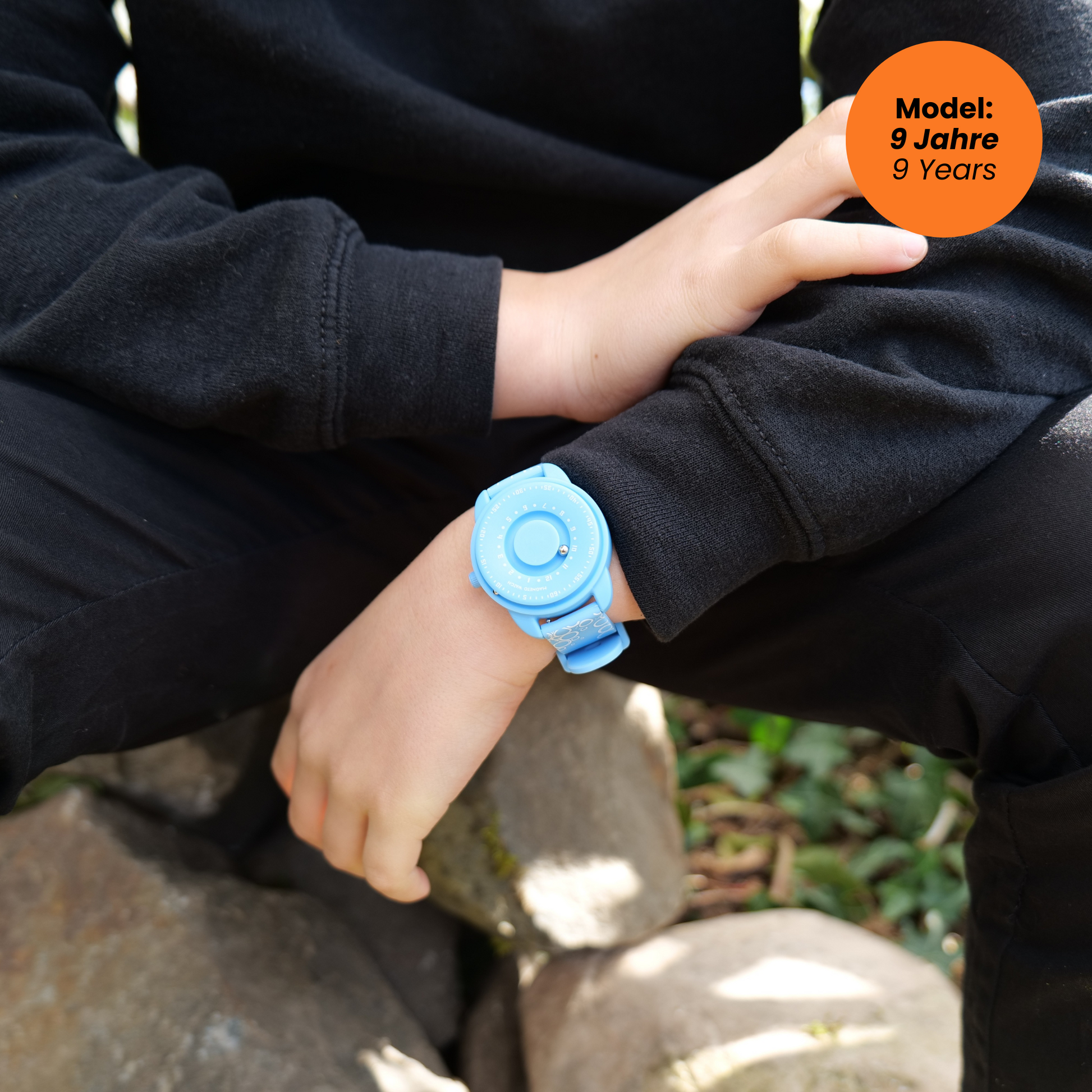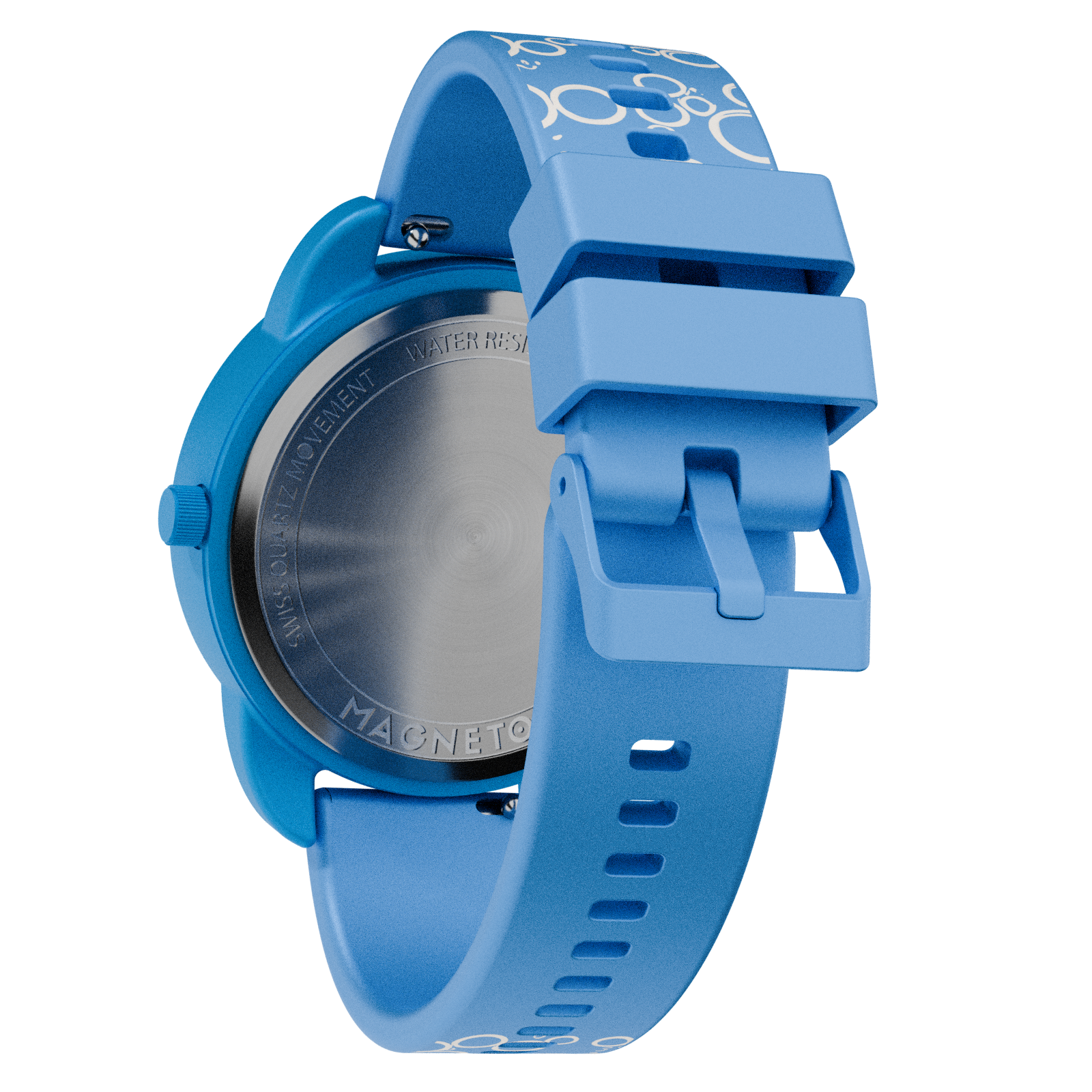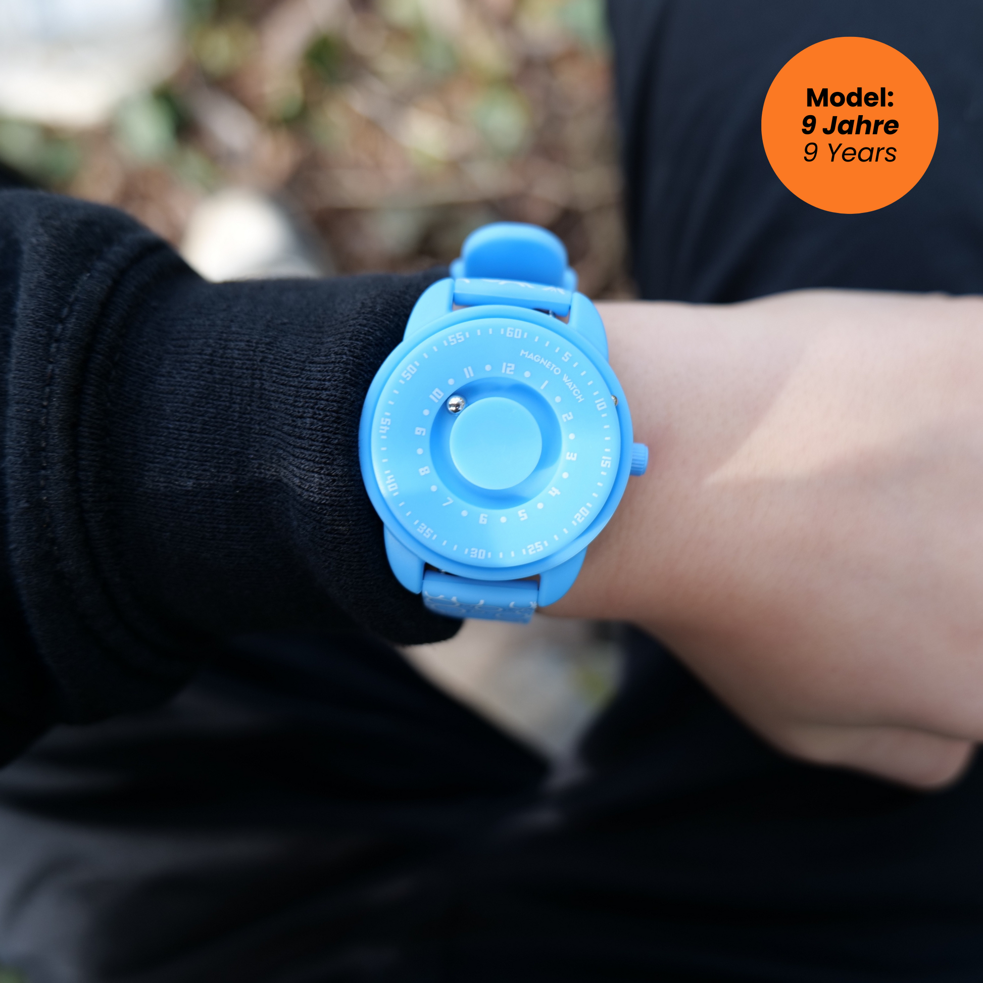 Bubbles Blue von Magneto Watch bringt eine frische Brise an jedes Kinderhandgelenk. Zwei Magnetkugeln – eine größere Innenkugel für die Stunden und eine kleinere Außenkugel für die Minuten – sorgen für ein außergewöhnliches Zeitablesen, das neugierige Blicke auf sich zieht. Das robuste Kunststoffgehäuse (ABS) ist angenehm leicht, während das blaue Silikonarmband mit blasenartigem Print an Seifenblasen erinnert. So wird das Erlernen der Uhrzeit zu einem fröhlichen Erlebnis – und Kinder haben immer einen coolen Hingucker am Handgelenk.