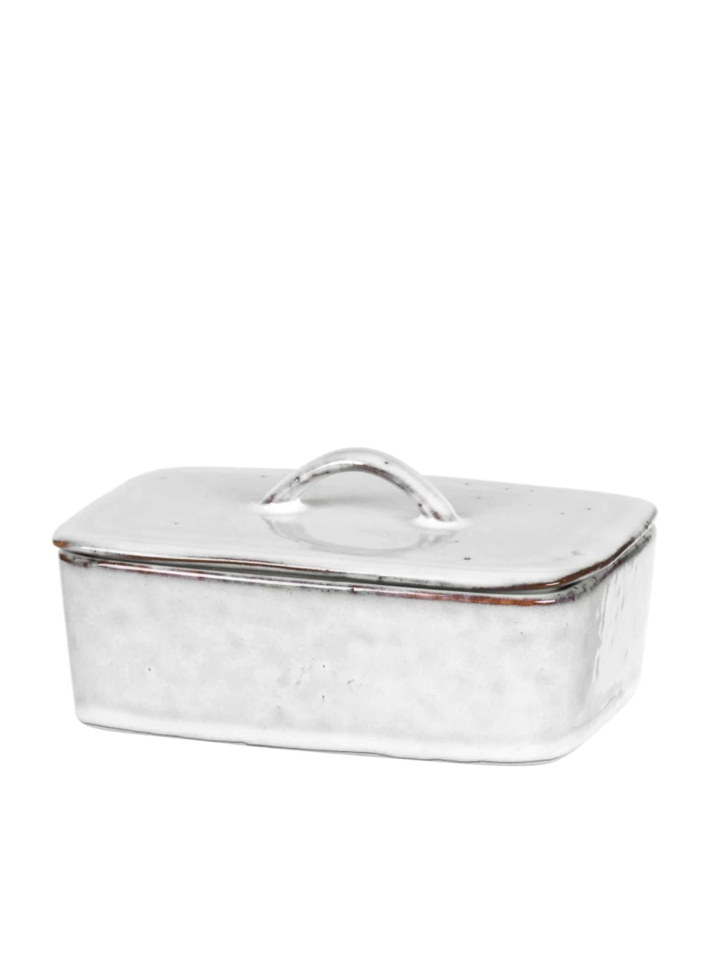 Butterdose der Serie Nordic Sand aus Steingut. Jedes Teil fällt in Farbe und Struktur etwas unterschiedlich aus. Unebenheiten unter der Lasur sind gewollt und Bestandteil des nordischen Designs. Weitere Teile der Serie werden ebenfalls angeboten.
