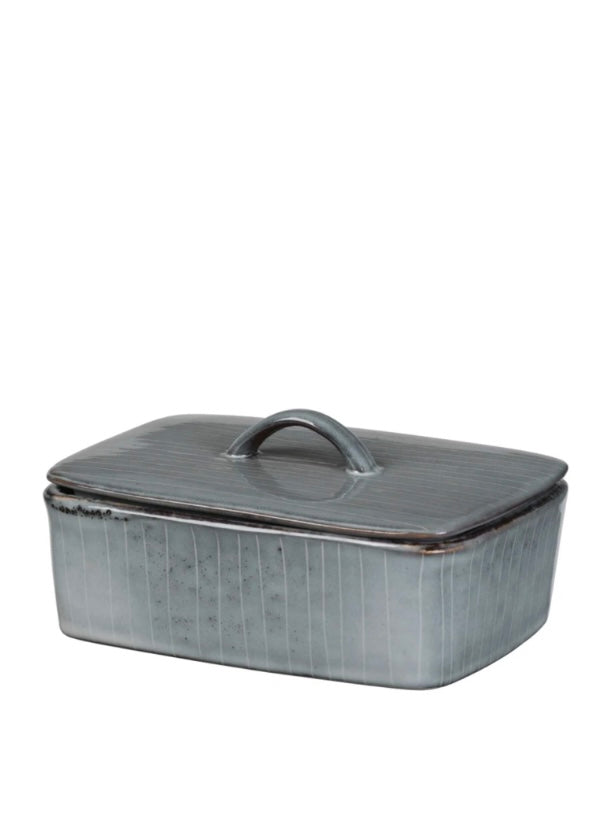 Butterdose der Serie Nordic Sea aus Steingut. Jedes Teil fällt in Farbe und Struktur etwas unterschiedlich aus. Unebenheiten unter der Lasur sind gewollt und Bestandteil des nordischen Designs. Weitere Teile der Serie werden ebenfalls angeboten.