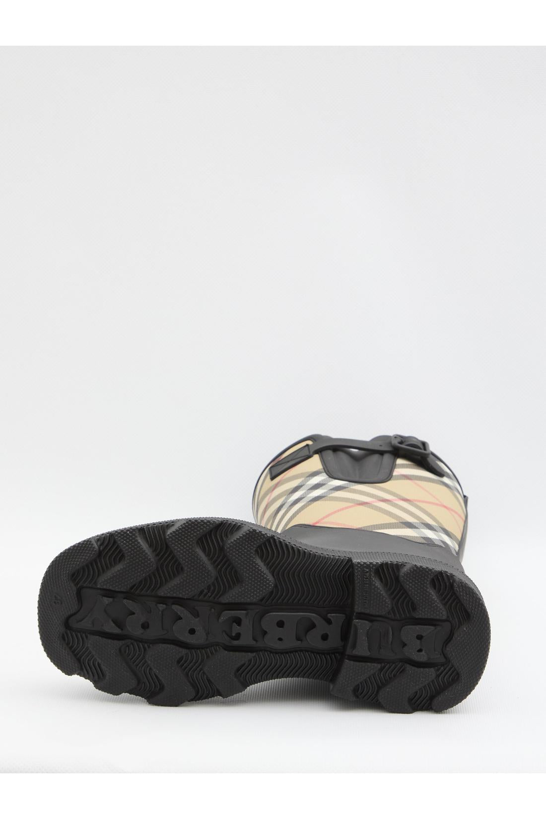 Black rubber and nylon rain boots. Feature woven Burberry Check in sand tone, adjustable buckle for fit, embossed Knight Stamp on the front, round toe, Burberry lettering on the sole. Dust bag included.