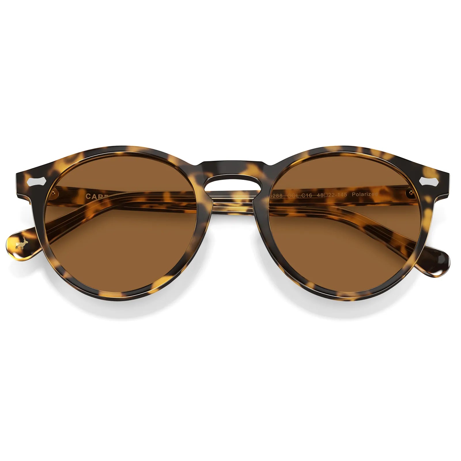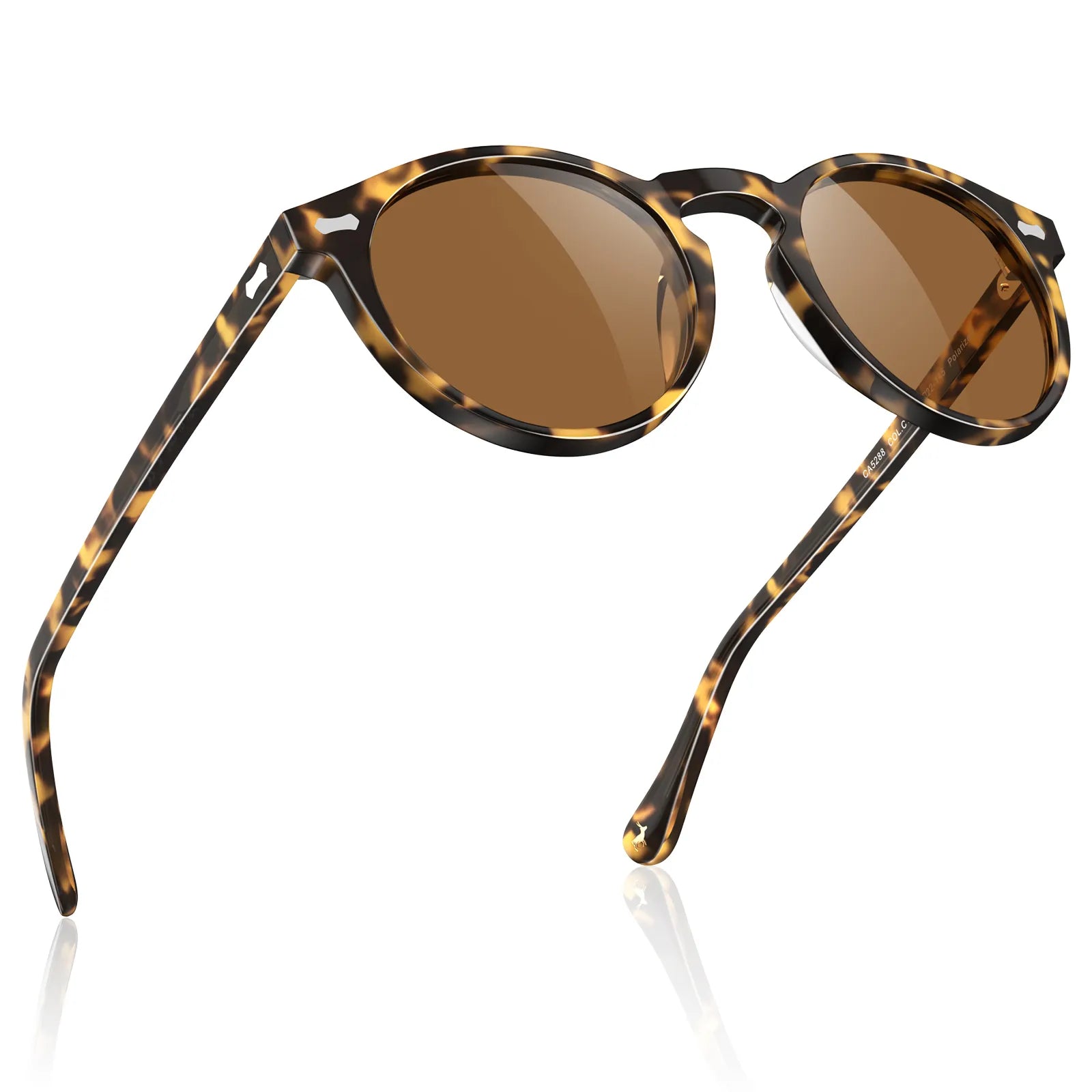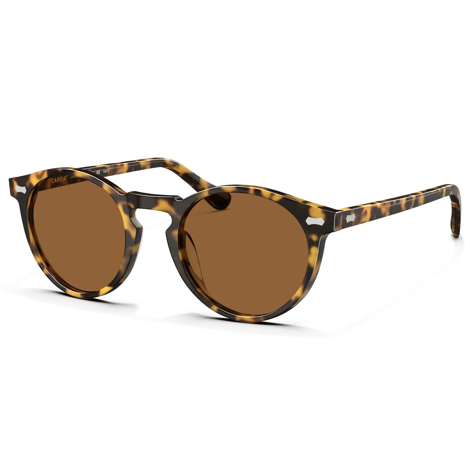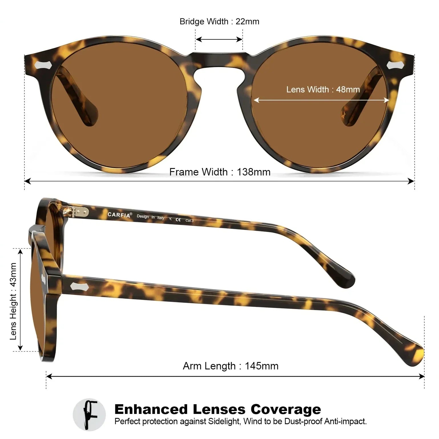 A modern interpretation of vintage design: With sleek contours for an active lifestyle, CARFIA round women's sunglasses are well-compatible with everyday clothes and can be the perfect decoration. Product Size - Lens width: 48 mm, Lens height: 43 mm, Bridge: 22 mm, Arm: 145 mm, Frame width: 138 mm.