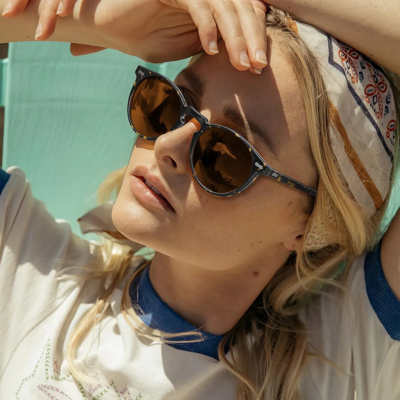A modern interpretation of vintage design: With sleek contours for an active lifestyle, CARFIA round women's sunglasses are well-compatible with everyday clothes and can be the perfect decoration. Product Size - Lens width: 48 mm, Lens height: 43 mm, Bridge: 22 mm, Arm: 145 mm, Frame width: 138 mm.