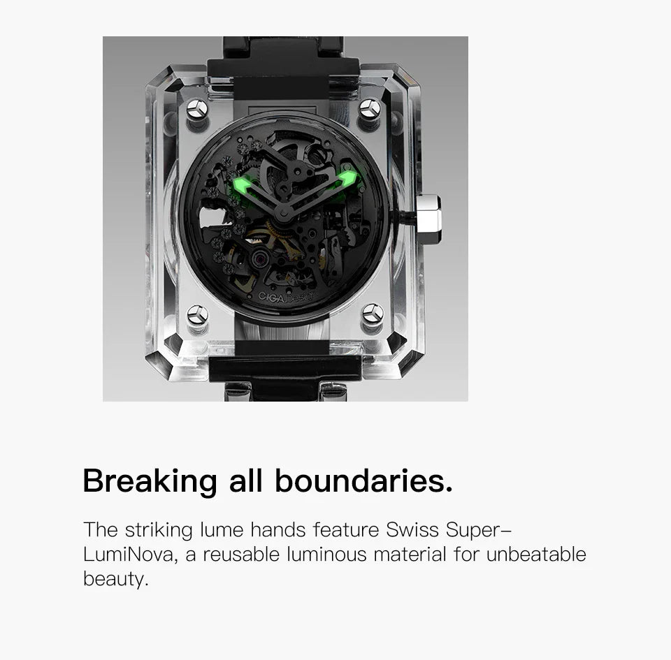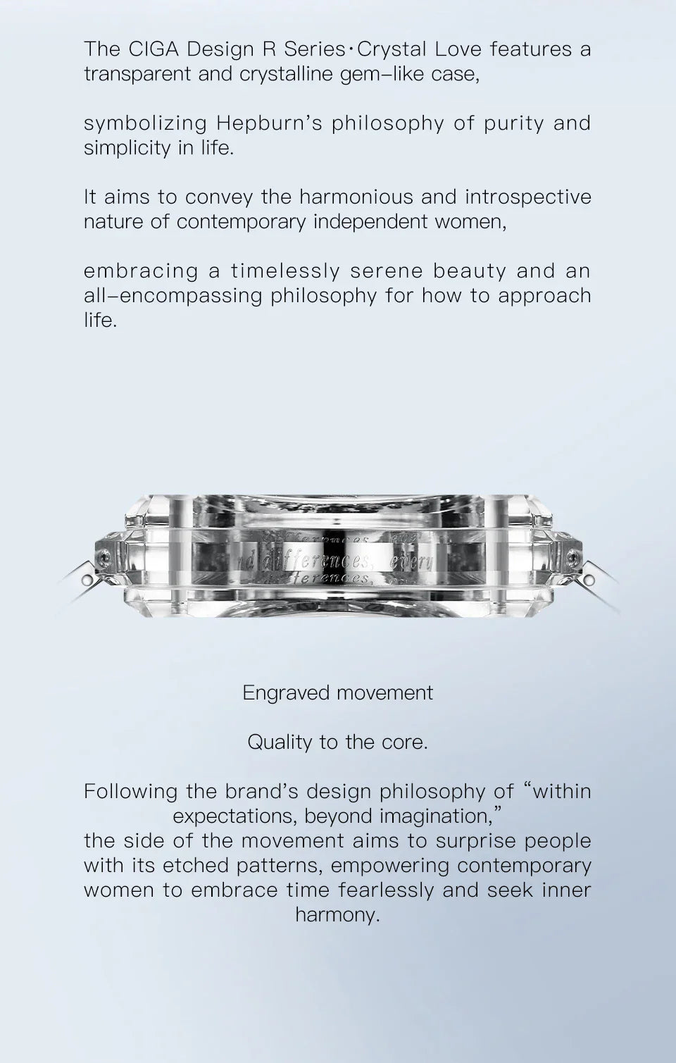 Inspired by the purity of crystal and the complexity of the human heart, the CIGA Design R Series Crystal Love is a true celebration of feminine strength, modern beauty, and mechanical brilliance. This luxury automatic skeleton watch showcases a fully transparent case that reveals the mesmerizing movement within—a symbol of openness, truth, and timeless love.