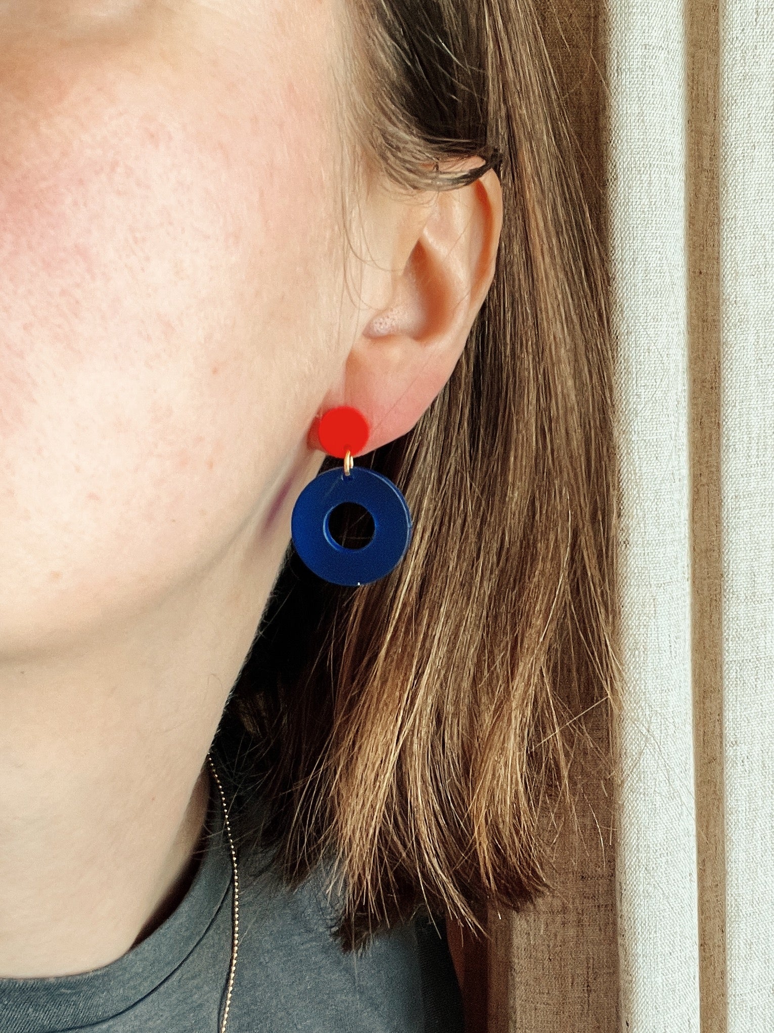 Der Mix aus tintenblauem Kreis und feuerrotem Punkt bringt Farbe in dein Styling – ganz ohne Schnickschnack, aber mit viel Wirkung.