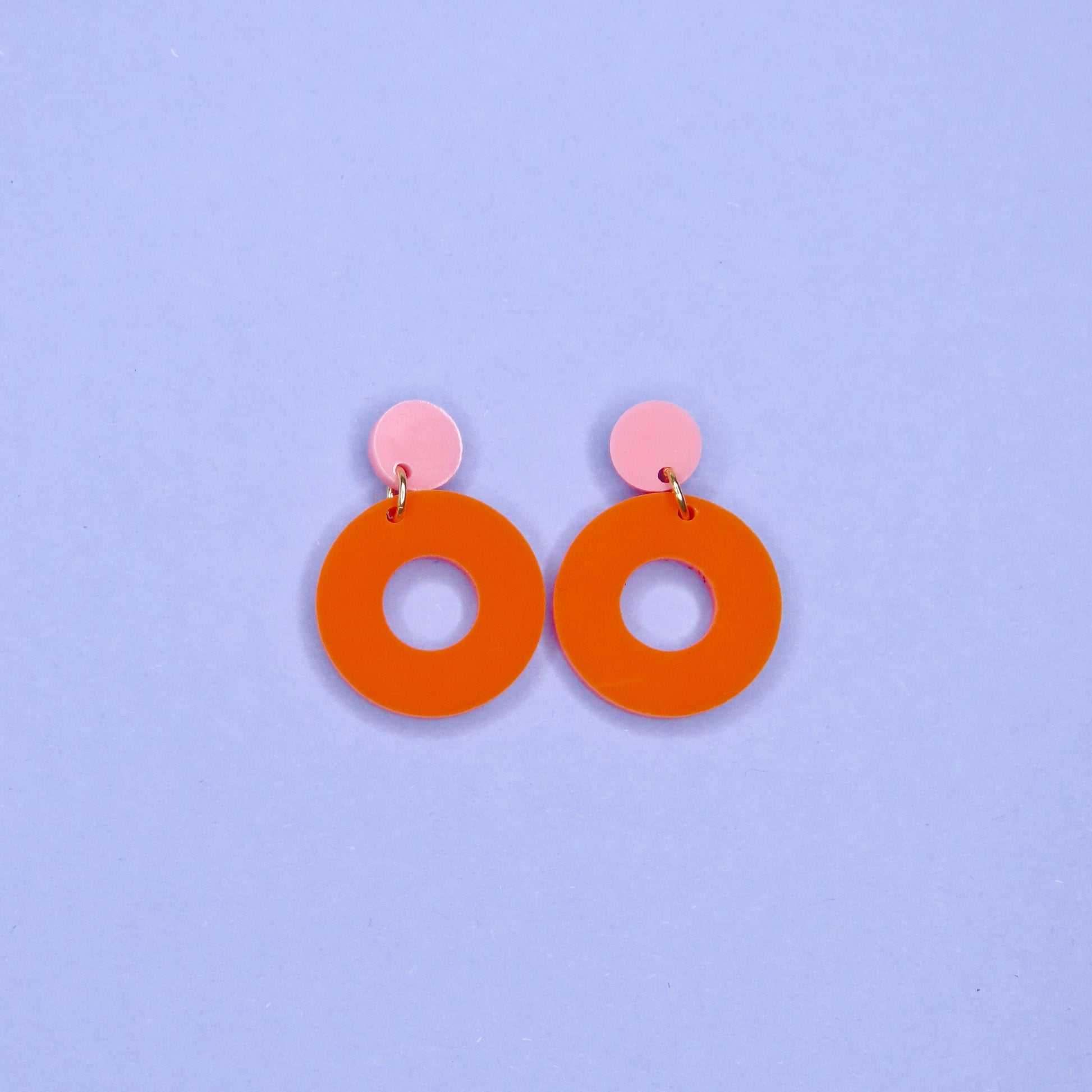 Die klaren geometrischen Formen – runder Dot und Ring – sorgen für ein minimalistisches, aber dennoch auffälliges Design. Durch den starken Farbkontrast zwischen sanftem Rosa und leuchtendem Orange entsteht ein lebendiges Zusammenspiel, das sofort ins Auge fällt.