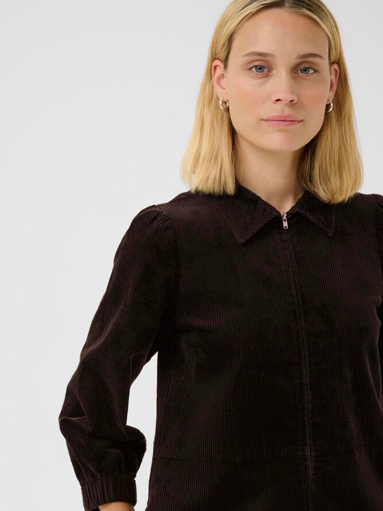 Sportives Hemdblusenkleid aus einem sehr soften und feinen Cordstretch. Schlichtes Design mit Hemdkragen, einer Taillennaht und seitlichen Eingrifftaschen in den Teilungsnähten. Rockteil leicht ausgestellt, etwas weitere Ärmel. Mit Ärmelbündchen und einem verdeckten Reißverschluss vorn gearbeitet. Ohne Futter. Sowohl als Kleid als auch als Longjacke zu tragen.
