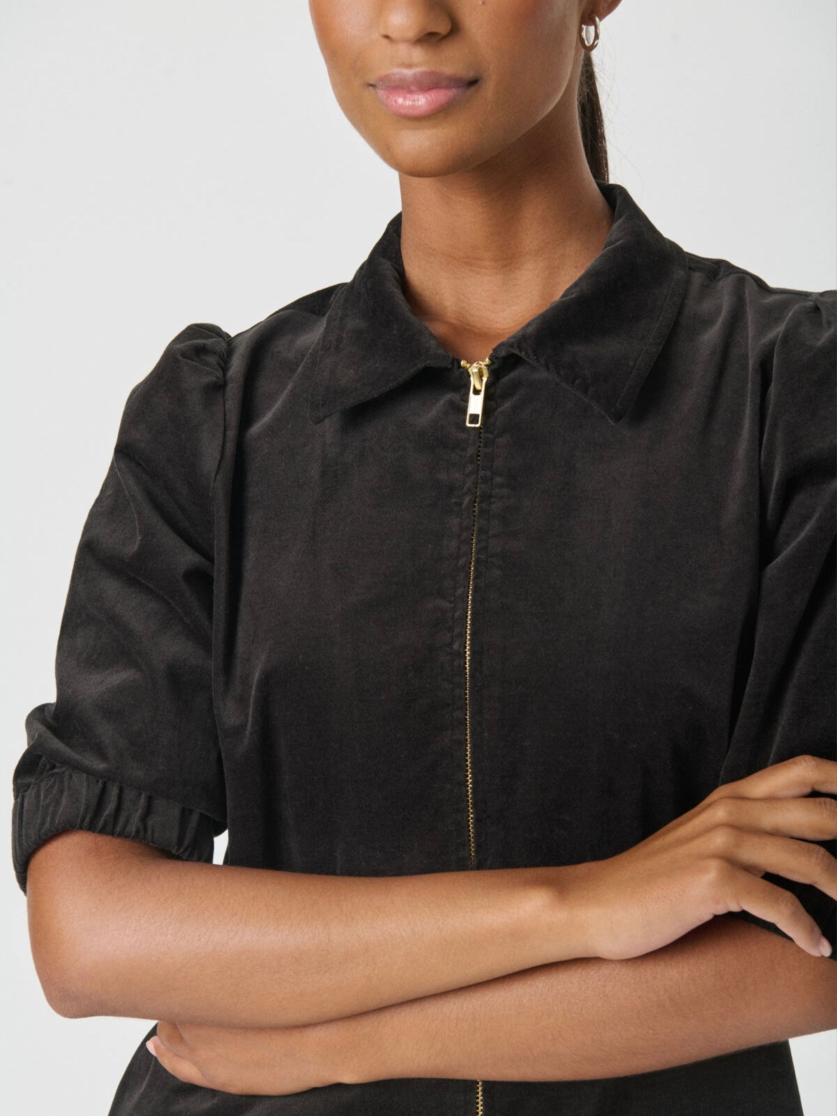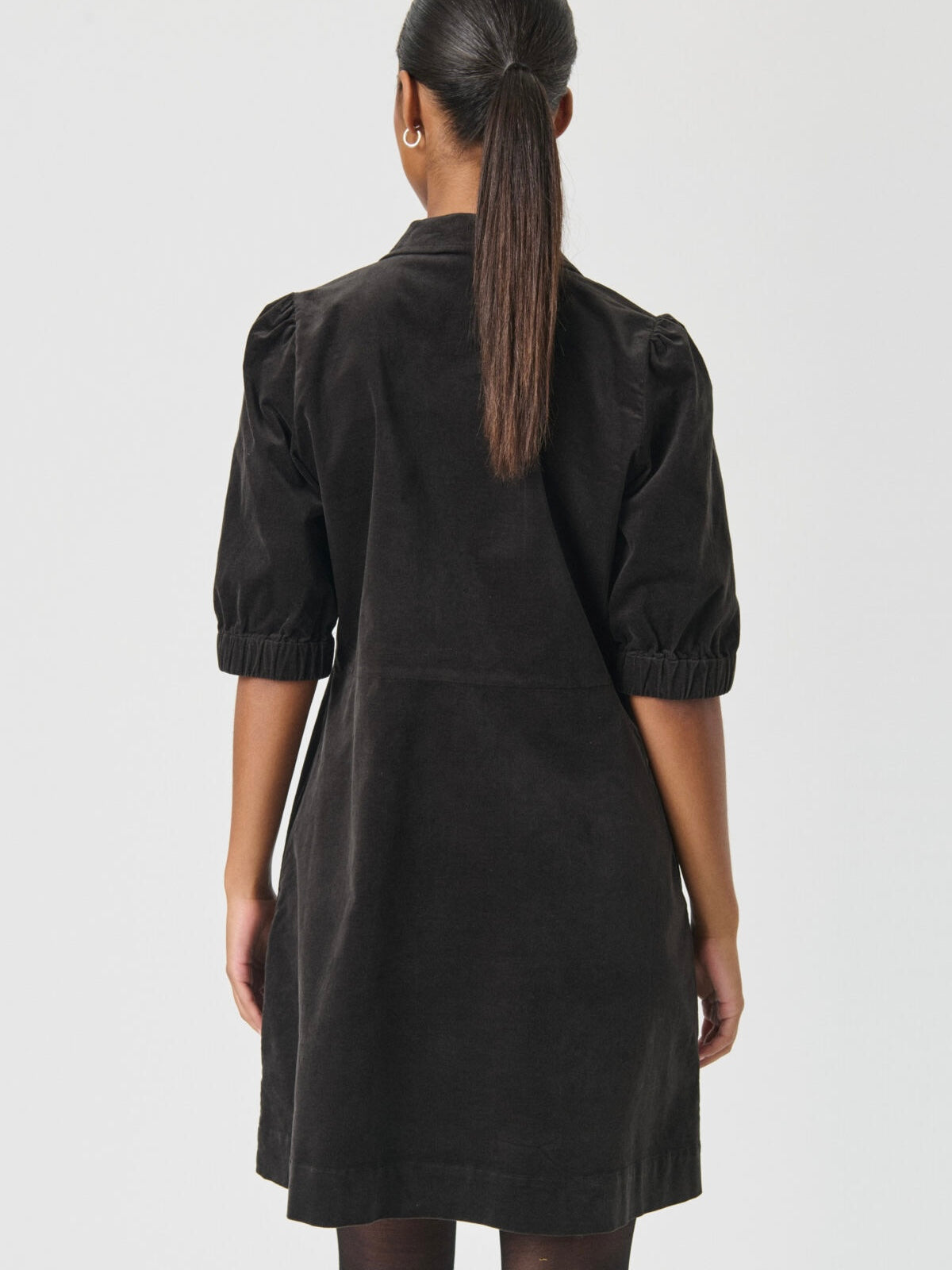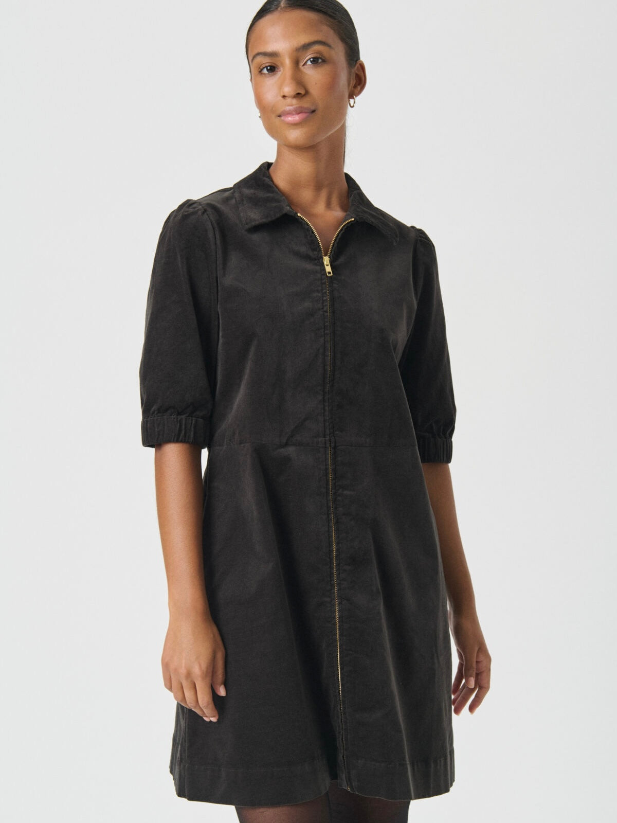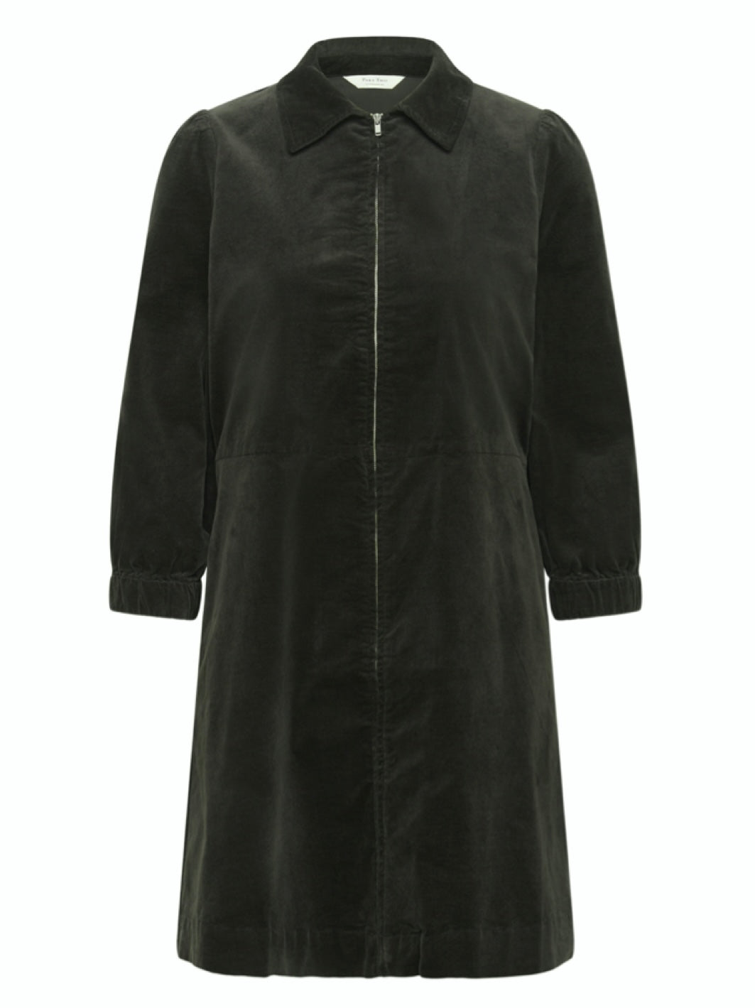 Sportiv elegantes Hemdblusenkleid aus einem sehr soften und feinen Cordstretch. Schlichtes Design mit Hemdkragen, einer Taillennaht und seitlichen Eingrifftaschen in den Teilungsnähten. Rockteil leicht ausgestellt, etwas weitere Ärmel. Mit Gummilbündchen und einem goldfarbenen Reißverschluss vorn gearbeitet. Ohne Futter. Sowohl als Kleid als auch als Longjacke zu tragen.