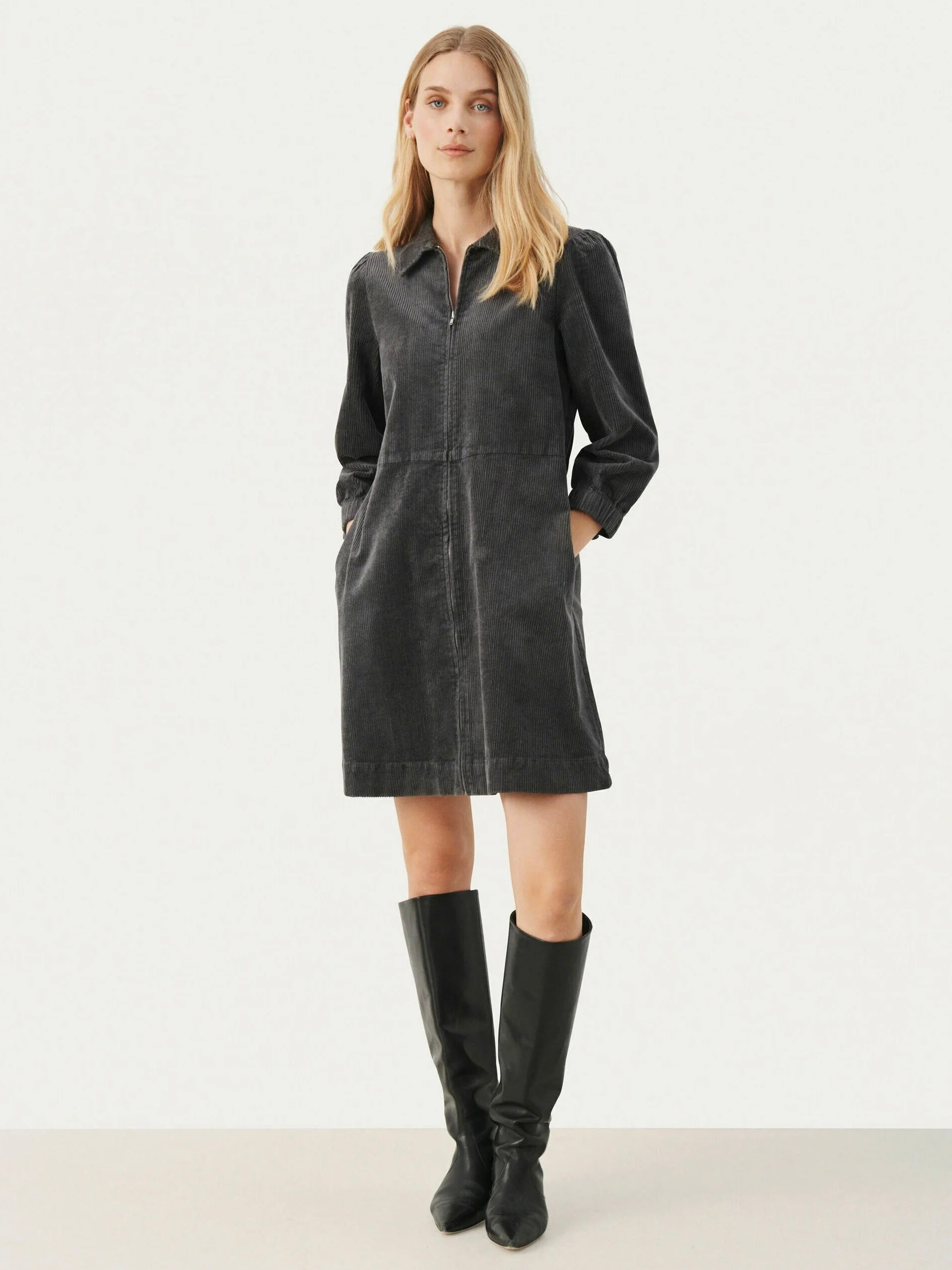 Sportives Hemdblusenkleid aus einem sehr soften und feinen Cordstretch. Schlichtes Design mit Hemdkragen, einer Taillennaht und seitlichen Eingrifftaschen in den Teilungsnähten. Rockteil leicht ausgestellt, etwas weitere Ärmel. Mit Ärmelbündchen und einem verdeckten Reißverschluss vorn gearbeitet. Ohne Futter.