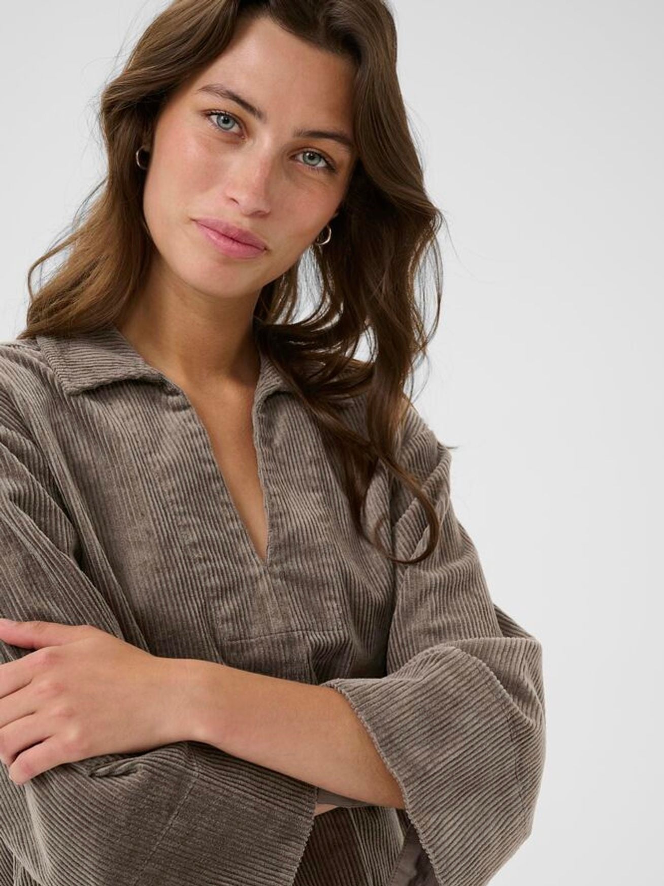 Sportives Etuikleid aus einem sehr soften und feinen Cordstretch. Schlichtes Design mit V-Ausschnitt und Hemdkragen, leicht überschnittenen Schultern und weiten 3/4 Ärmeln. Ohne Futter gearbeitet.