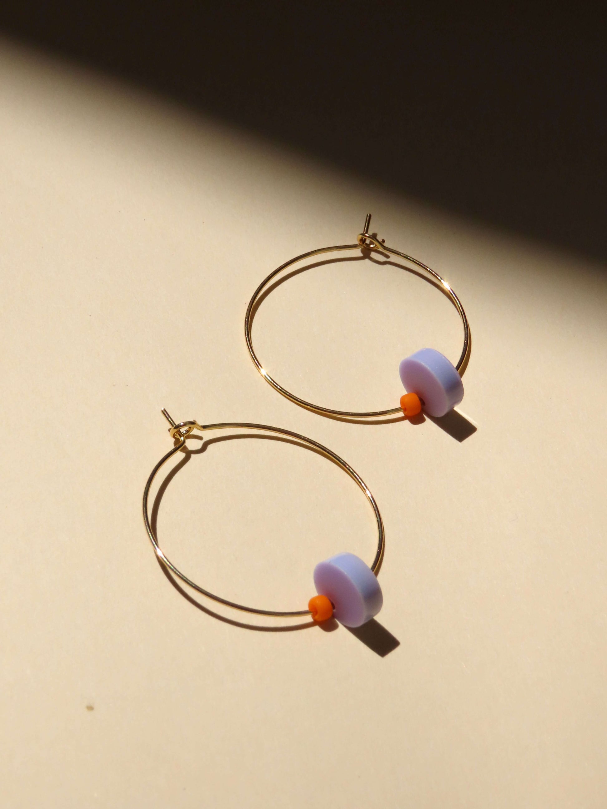 Diese handgefertigten Creolen vereinen leichtes Tragegefühl mit modernem Design. Der fliederfarbene Acryl-Dot und die kleine warme orange Glasperle setzen dezente Farbakzente, die sich vielseitig kombinieren lassen.