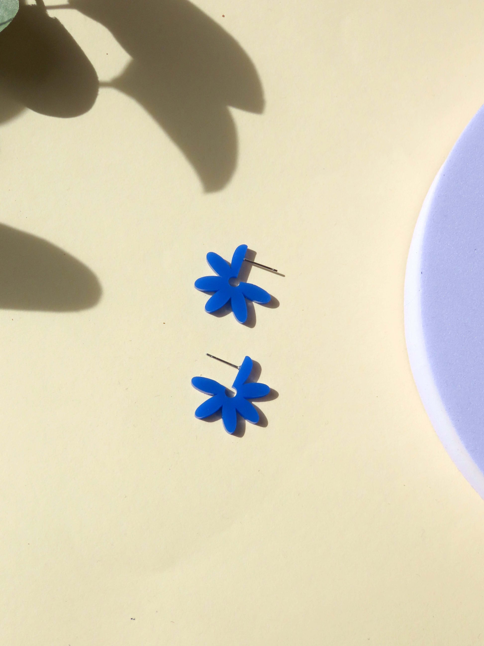 Die gelaserten Flower-Ohrringe zeigen sich in einem kräftigen Kobaltblau – intensiv, leuchtend und voller Energie. Die Form erinnert an eine stilisierte Margerite, mit weichen, organisch geschnittenen Blütenblättern, die spielerisch rund um die Mitte angeordnet sind.