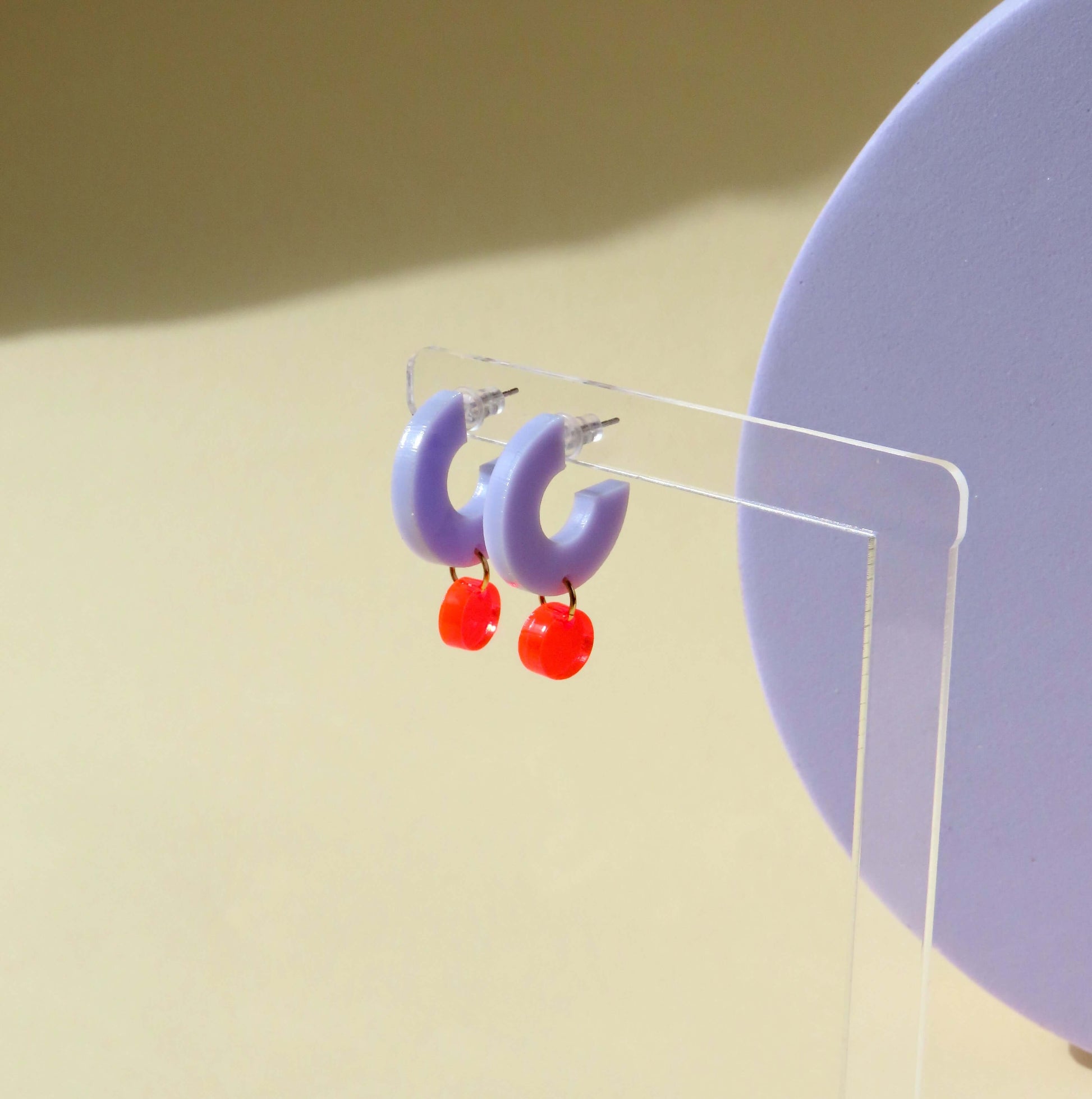 Diese kleinen Designlieblinge haben's in sich: Fliederfarbene Creolen mit auffälligem roten Anhänger. Die cleane Halbkreisform kombiniert mit dem leuchtenden Dot ist stylisch, modern und verspielt zugleich.