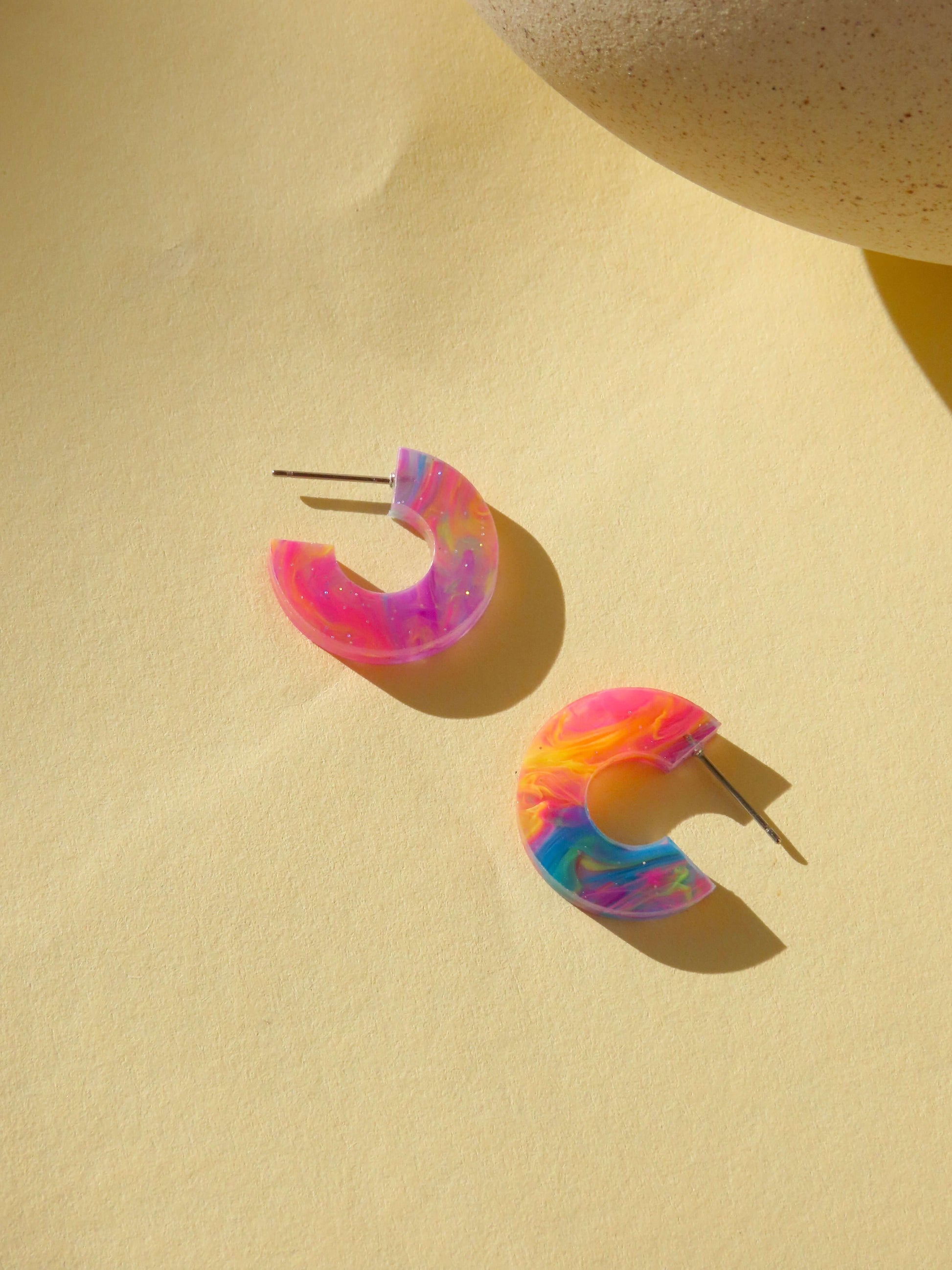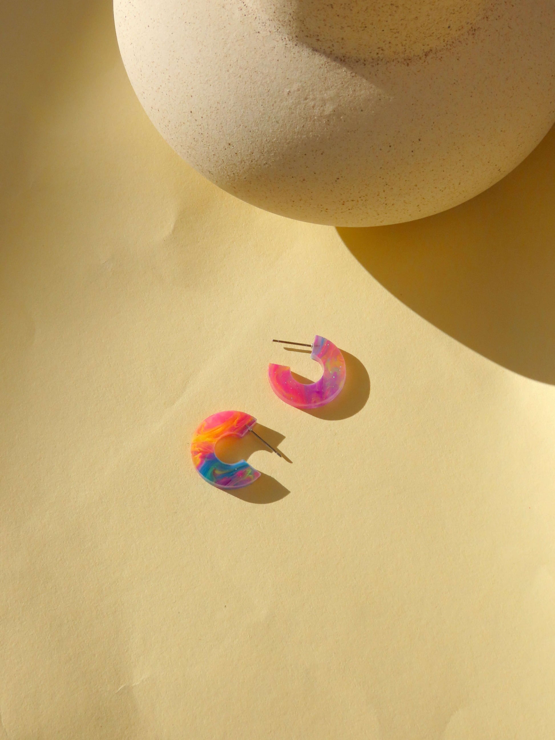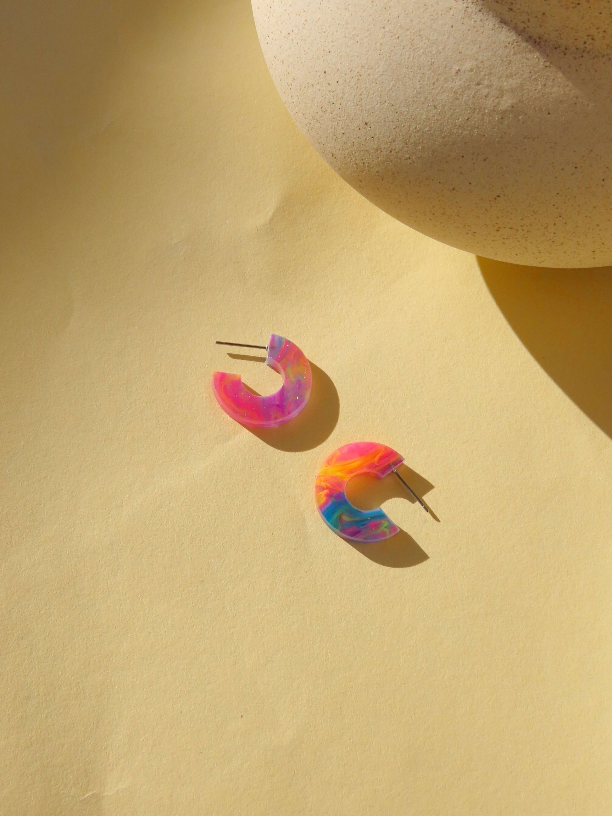 Die offene Kreisform sorgt für ein modernes, cleanes Design, das durch die bunten Wirbel verspielt wirkt. Acryl macht die Ohrringe federleicht, während Edelstahl für angenehmen, hautfreundlichen Tragekomfort sorgt.