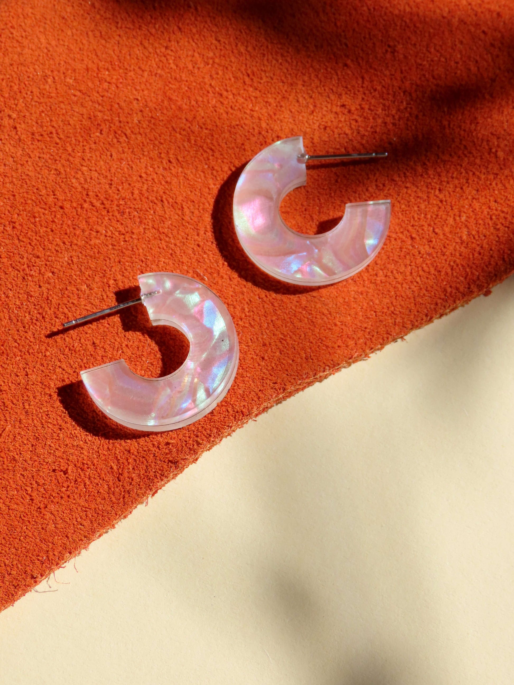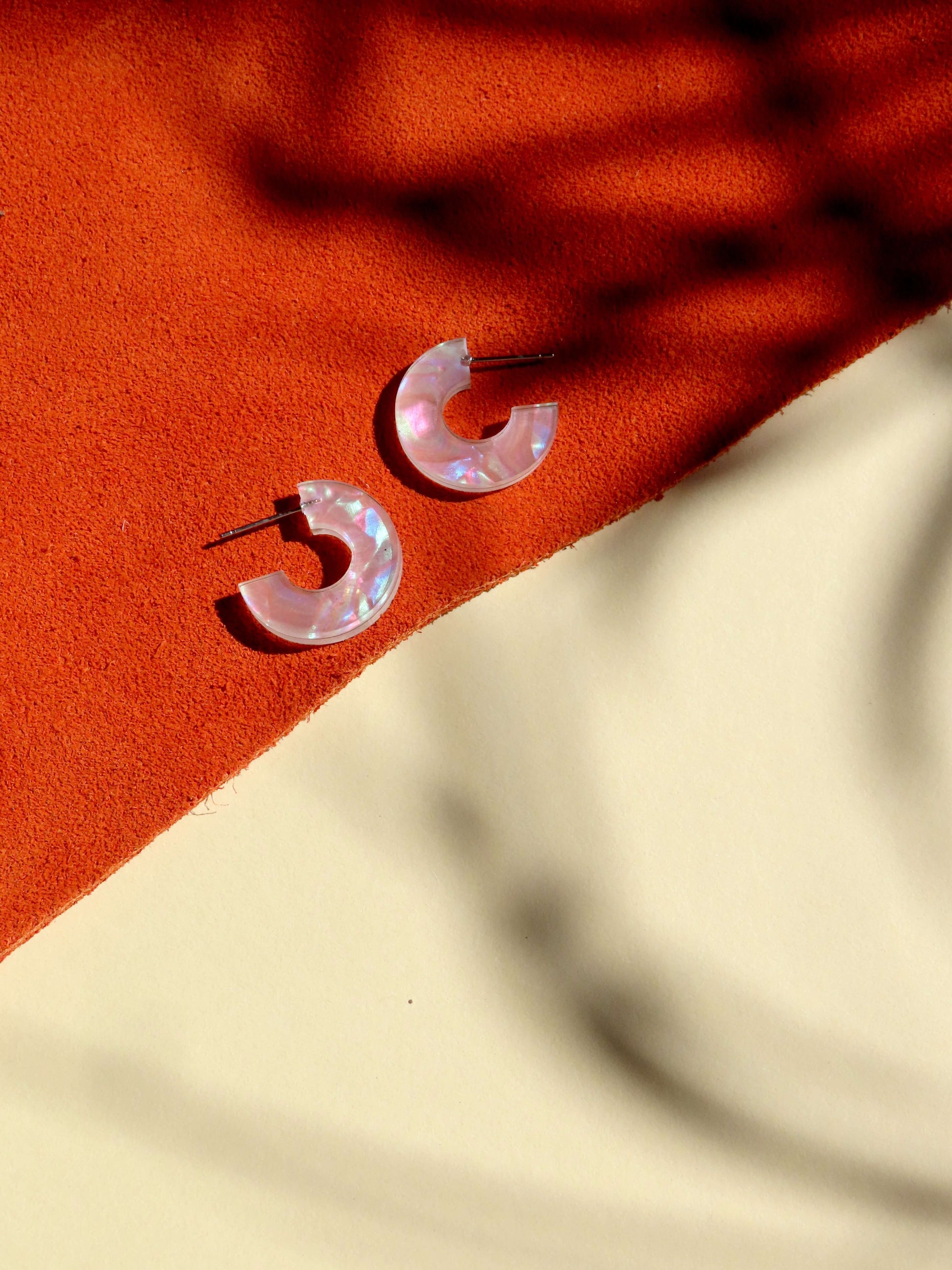 Diese Simmi Creolen sind ein kleines Kunstwerk aus Licht und Farbe. Das perlweiße Acryl schimmert je nach Bewegung in zarten Regenbogen-Reflexen – mal rosa, mal bläulich, mal fast durchsichtig. Dieser Effekt verleiht den Ohrringen eine schillernde, fast magische Ausstrahlung, die sofort ins Auge fällt.