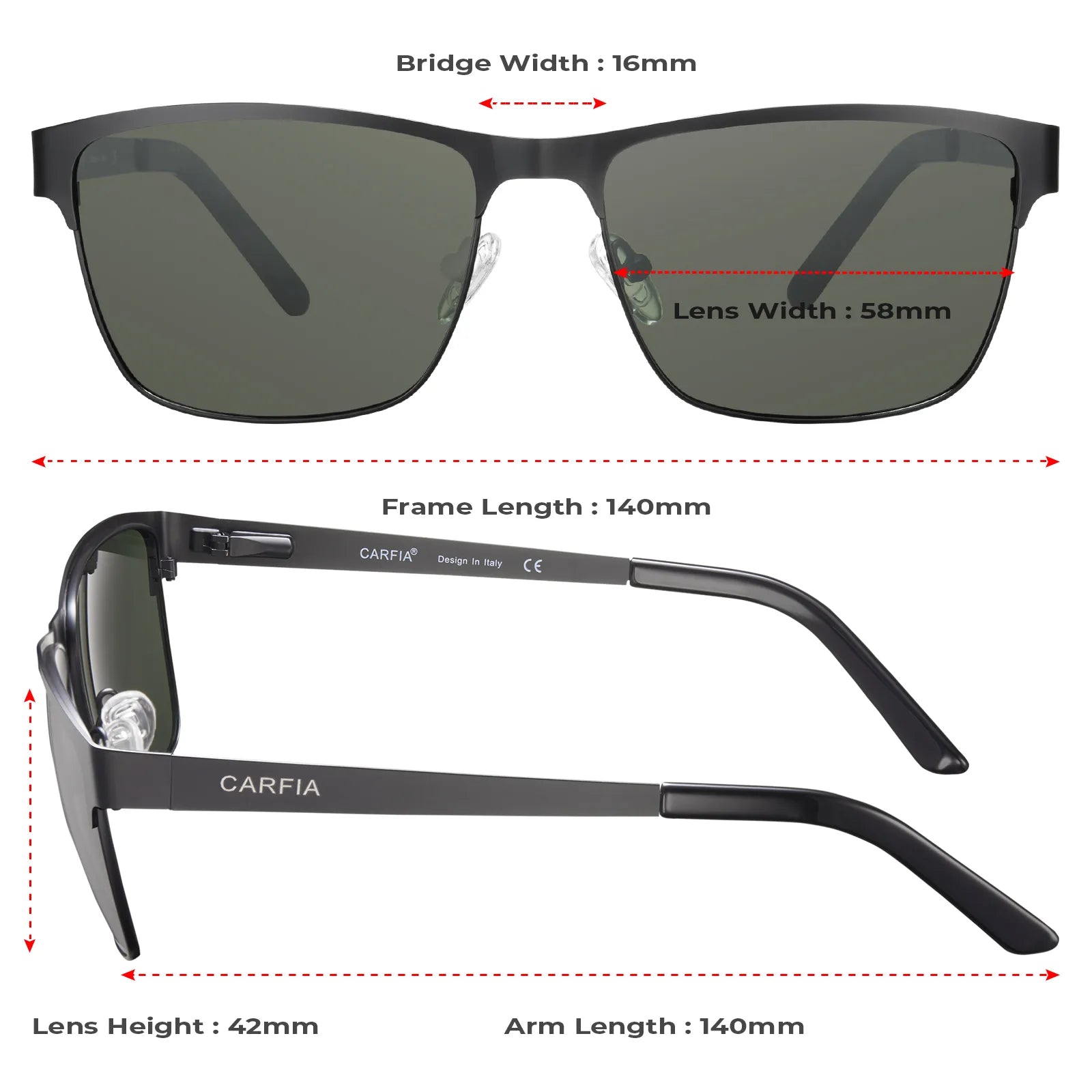 Convenient Accessories and Glare Prevention - When not in use, these sunglasses come with a cleaning cloth and a nice leather case. Whether you're a sports champion, a weekend warrior, or just someone who enjoys the sun, these shades do an excellent job of preventing unwanted and distractive glare, optimizing safety and performance throughout the day. Size and Design Details: Lens width: 58mm, Lens height: 45mm, Bridge: 16mm, Arm: 140mm, Frame Width: 141mm. They have a classic design with the CARFIA logo displayed on the temples and are available in a wide range of lens colors to suit your lifestyle.