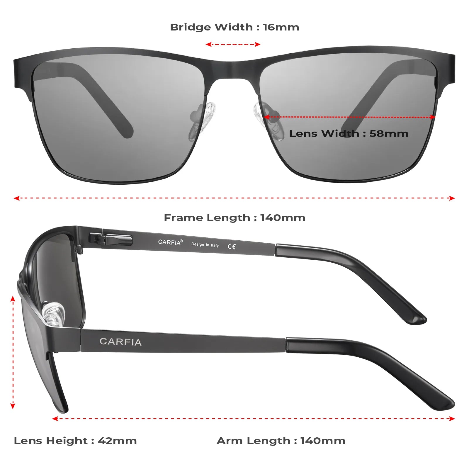 Convenient Accessories and Glare Prevention - When not in use, these sunglasses come with a cleaning cloth and a nice leather case. Whether you're a sports champion, a weekend warrior, or just someone who enjoys the sun, these shades do an excellent job of preventing unwanted and distractive glare, optimizing safety and performance throughout the day. Size and Design Details: Lens width: 58mm, Lens height: 45mm, Bridge: 16mm, Arm: 140mm, Frame Width: 141mm. They have a classic design with the CARFIA logo displayed on the temples and are available in a wide range of lens colors to suit your lifestyle.