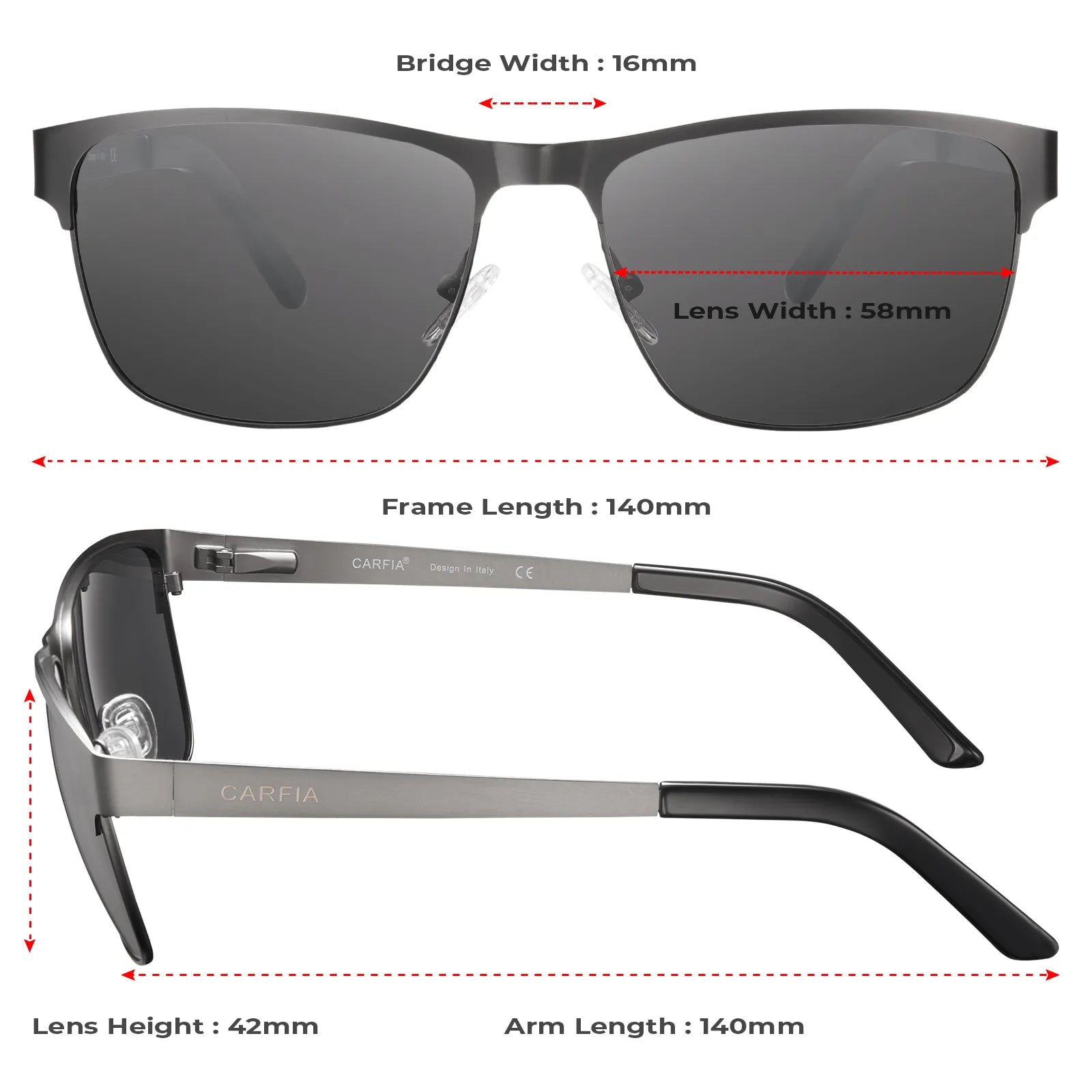 Convenient Accessories and Glare Prevention - When not in use, these sunglasses come with a cleaning cloth and a nice leather case. Whether you're a sports champion, a weekend warrior, or just someone who enjoys the sun, these shades do an excellent job of preventing unwanted and distractive glare, optimizing safety and performance throughout the day. Size and Design Details: Lens width: 58mm, Lens height: 45mm, Bridge: 16mm, Arm: 140mm, Frame Width: 141mm. They have a classic design with the CARFIA logo displayed on the temples and are available in a wide range of lens colors to suit your lifestyle.
