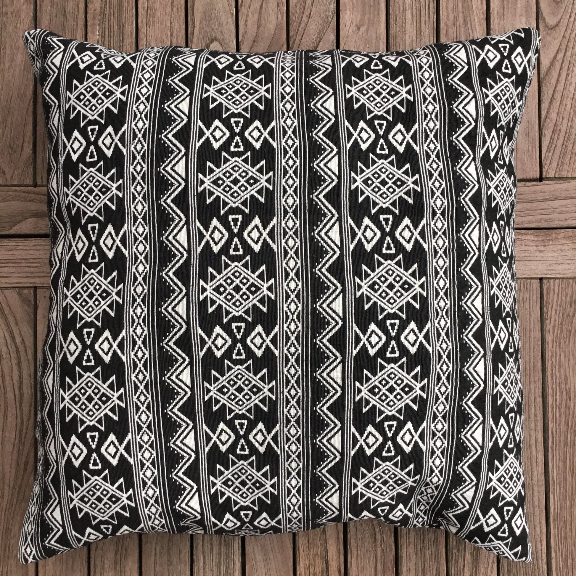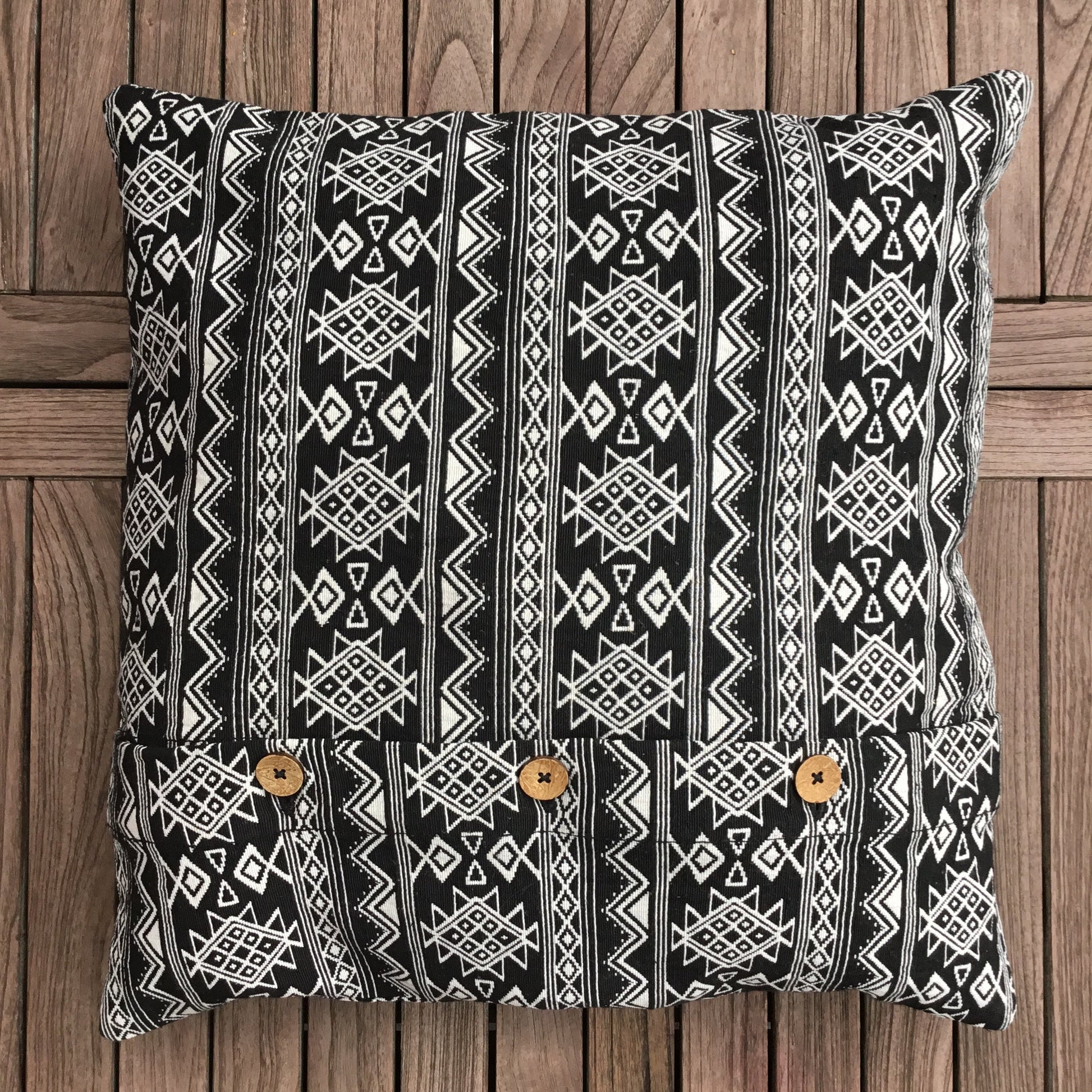 Das individuelle, ethnisch inspirierte Dessin verleiht diesem Dekokissen aus reiner Baumwolle seine Wertigkeit. Mit 3 dekorativen Holzknöpfen zu schließen.
