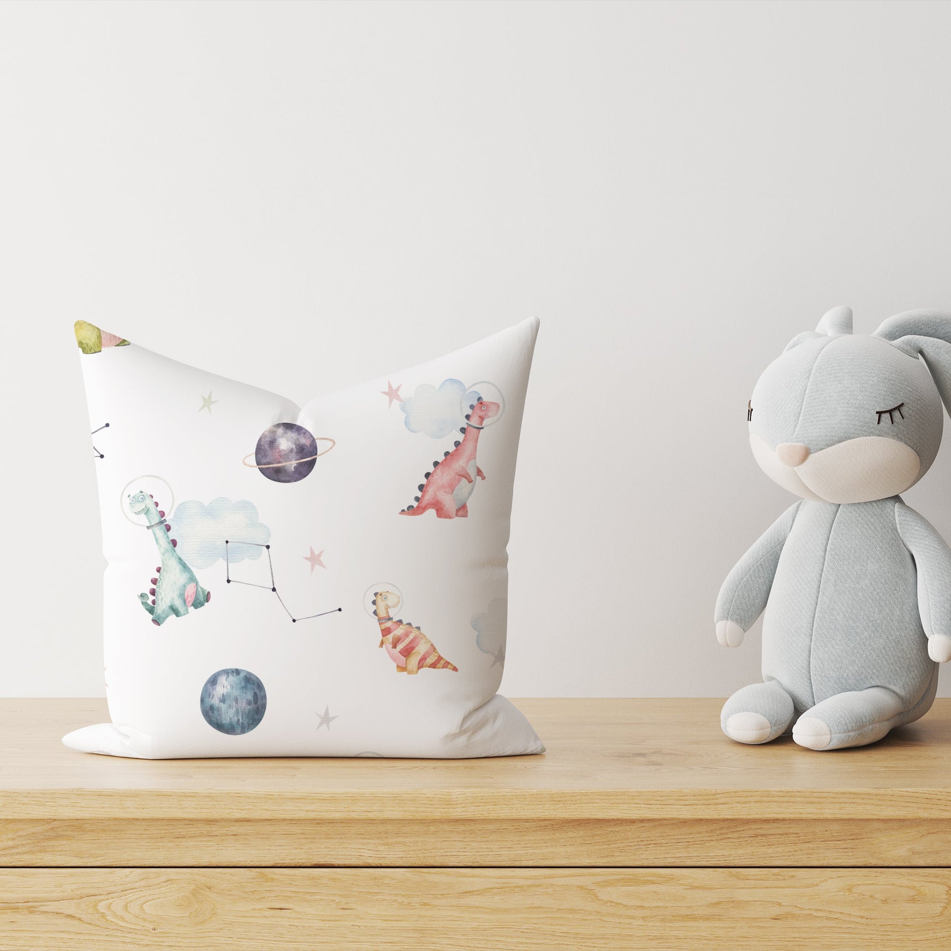 Unser Dino Galaxy Dekokissen vereint süße Dinos, Planeten und Sternbilder – ein Lieblingsplatz für kleine Träumer*innen und Weltraumentdecker.