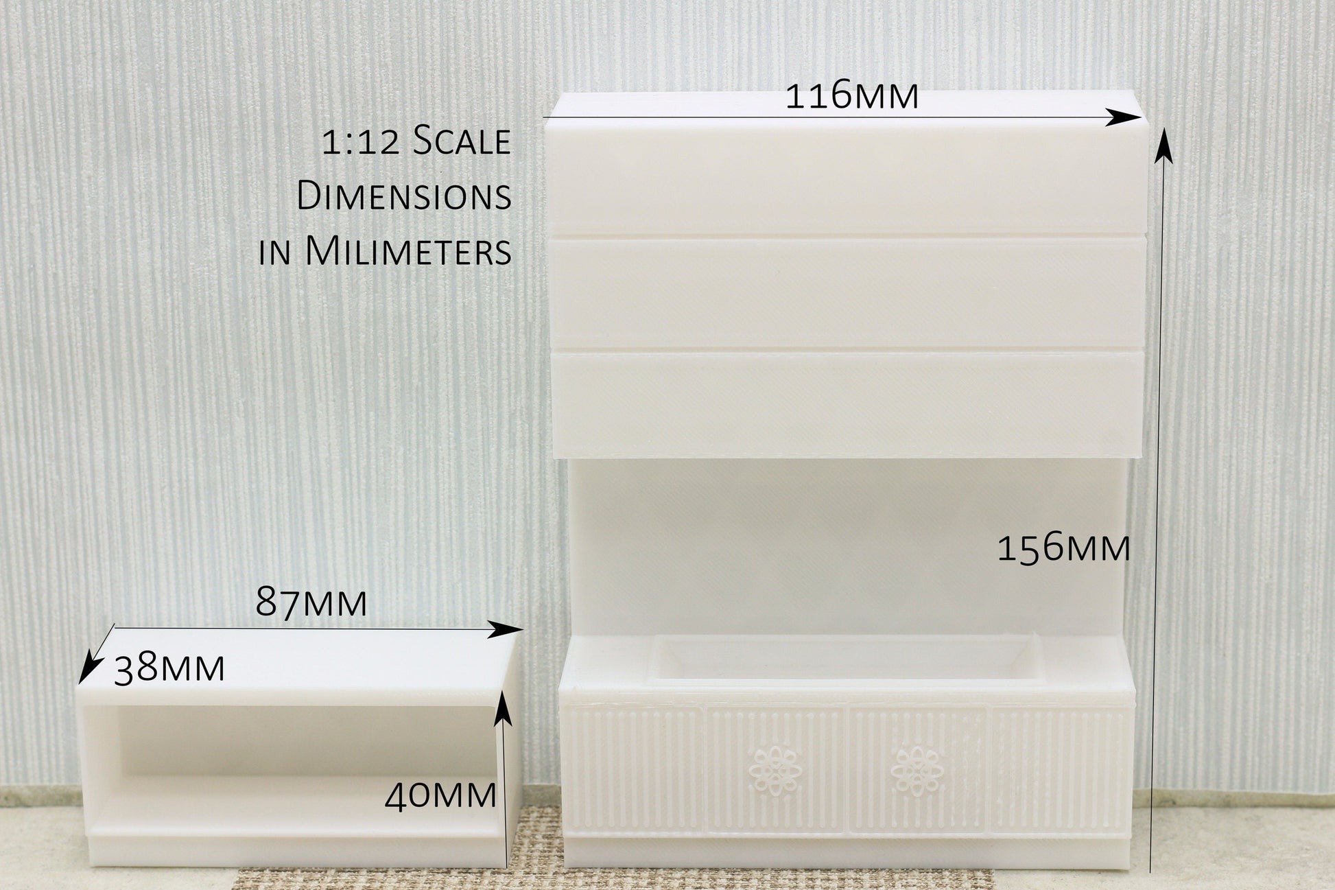 This Fireplace with Low Side Board can be a great addition to your modern dollhouse living room. It includes the main fire place and one low side board. What makes it special is that you can have it wide as you want by adding more side boards.