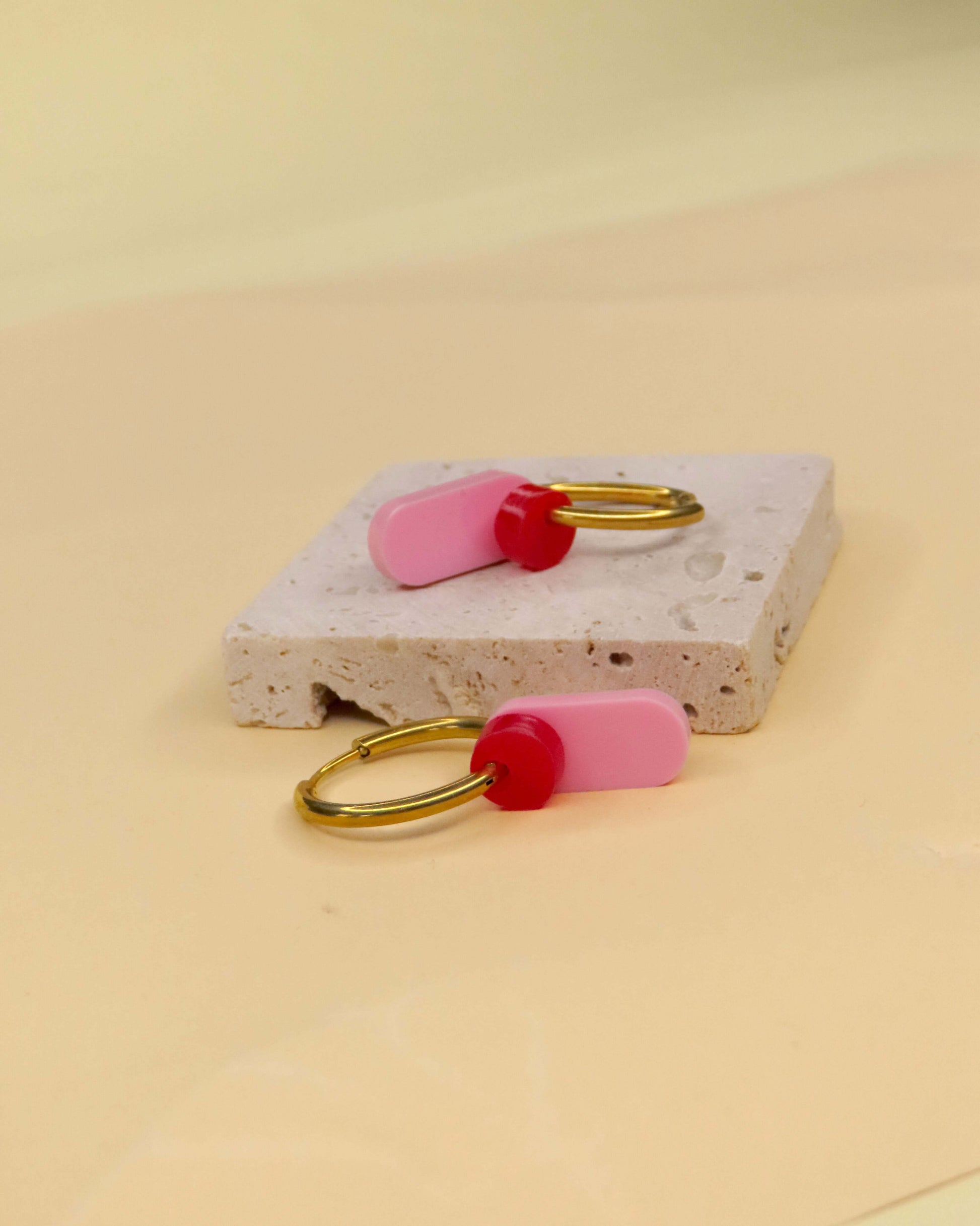 Statement mit Stil 🎨 Diese Edelstahl-Creolen mit ihren charmant grafischen Anhängern in Rosa und Rot setzen auf klare Farben und leichte Materialien. Der sanfte Rosa-Ton wird vom kräftigen Rot perfekt akzentuiert – modern, verspielt und absolut kombinierfreudig.